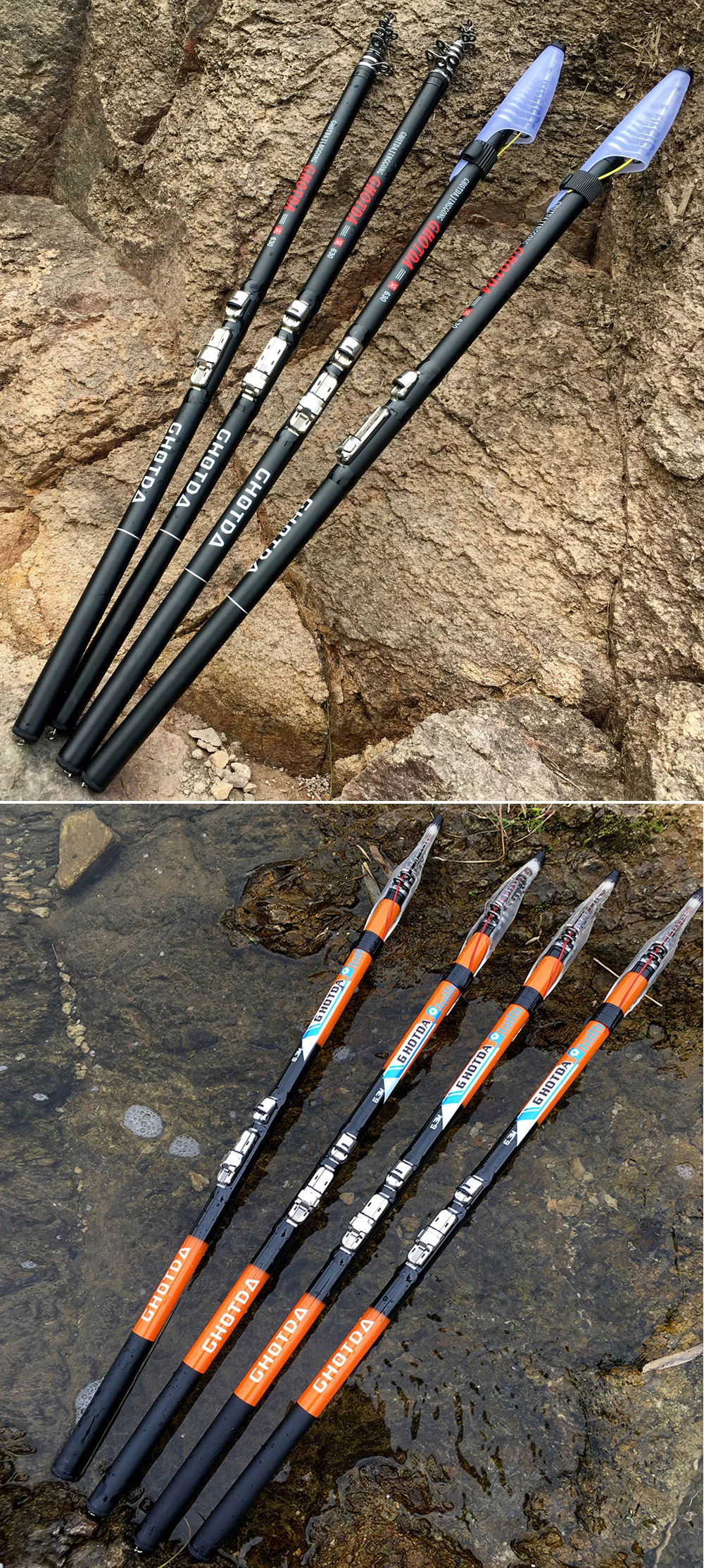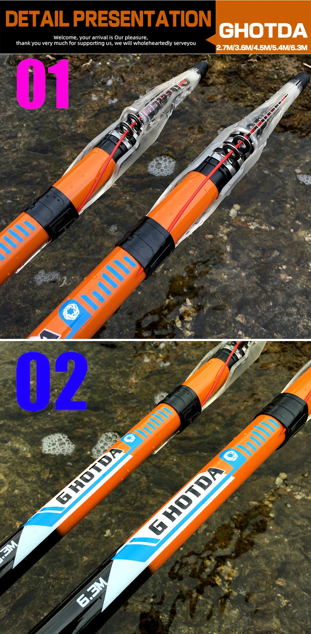 1. Con su diseño giratorio telescópico, esta caña de pescar viene en una gama de tamaños-2,7 M, 3,6 M, 4,5 M, 5,4 M, y 6,3 M, lo que lo hace ideal para su uso en diversos escenarios, incluidos estanques de depósito, océanos y pesca en roca.