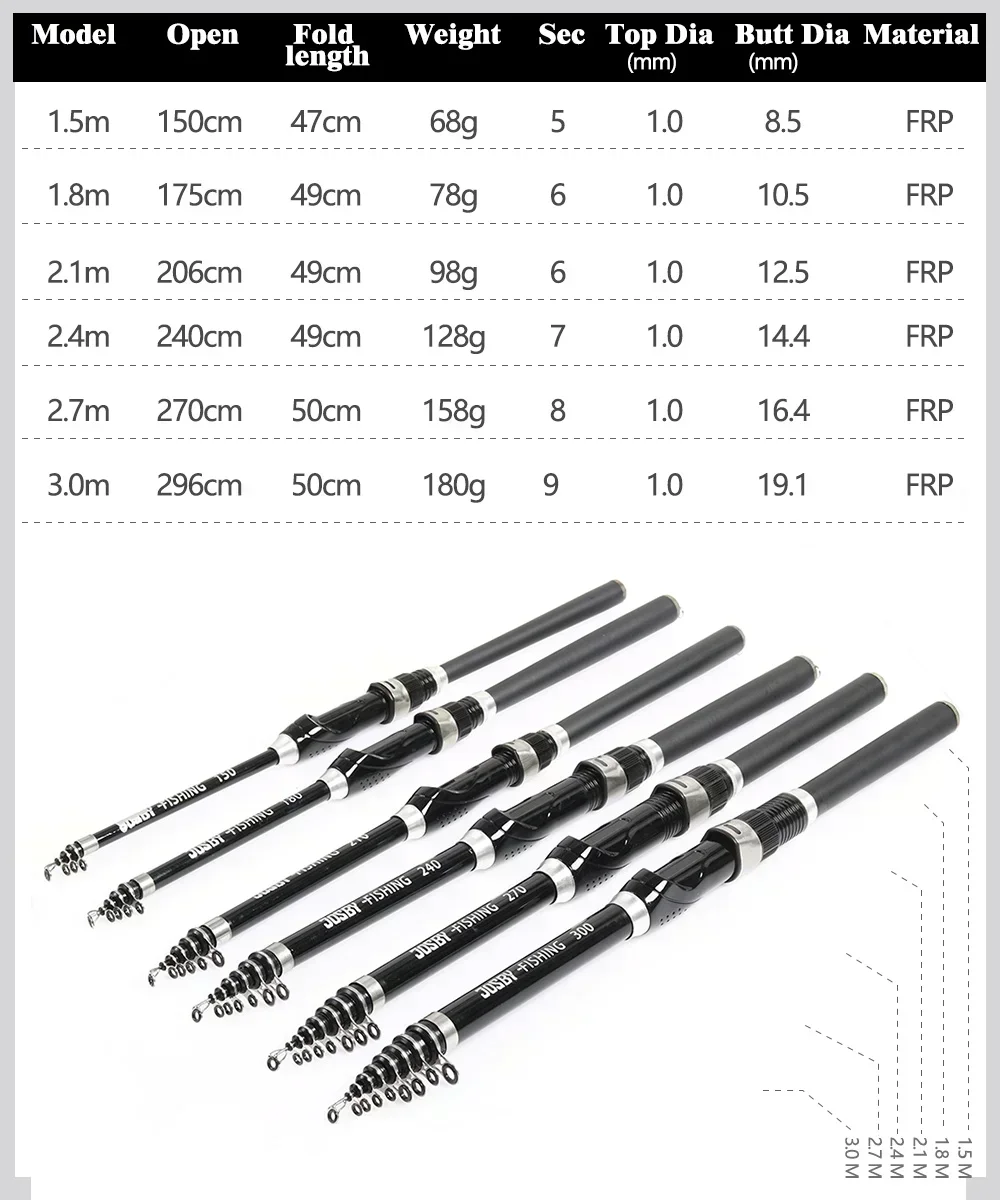 Caña de pescar giratoria duradera, alimentador telescópico portátil de fibra de carbono, aparejos de viaje súper cortos, 1,5 M-3,0 M