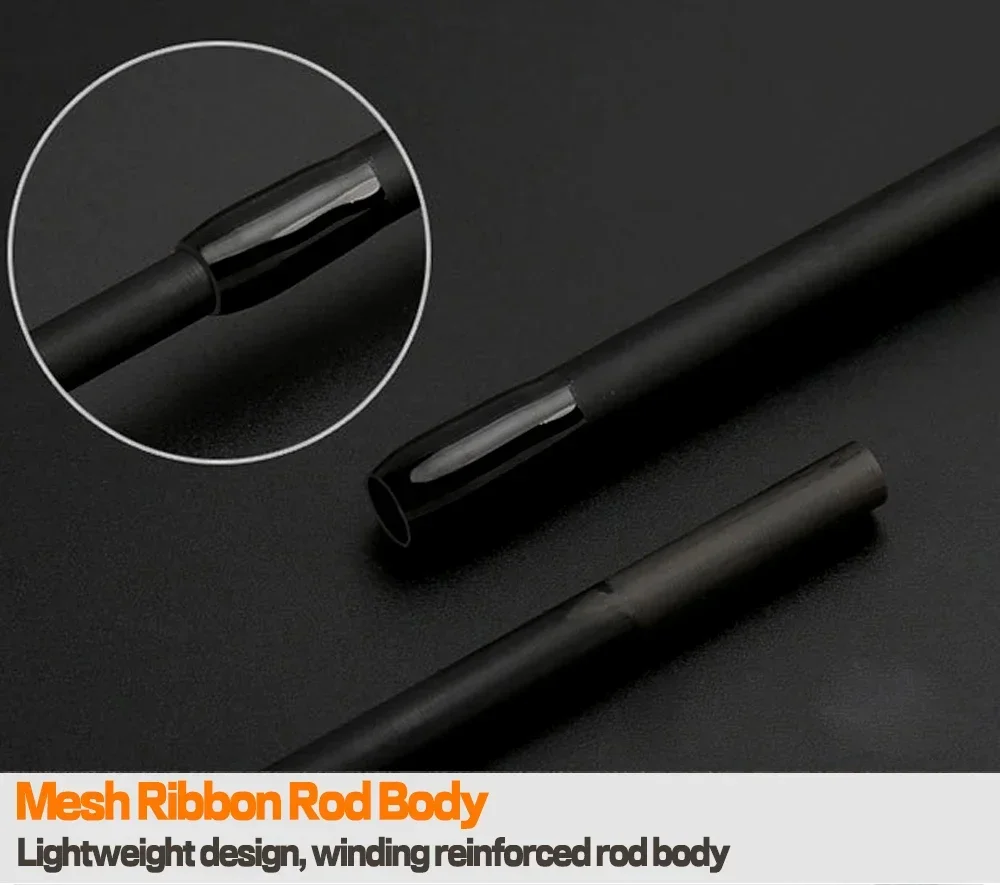 Esta caña de pescar está hecha de fibra de alto carbono, resistente y duradera.