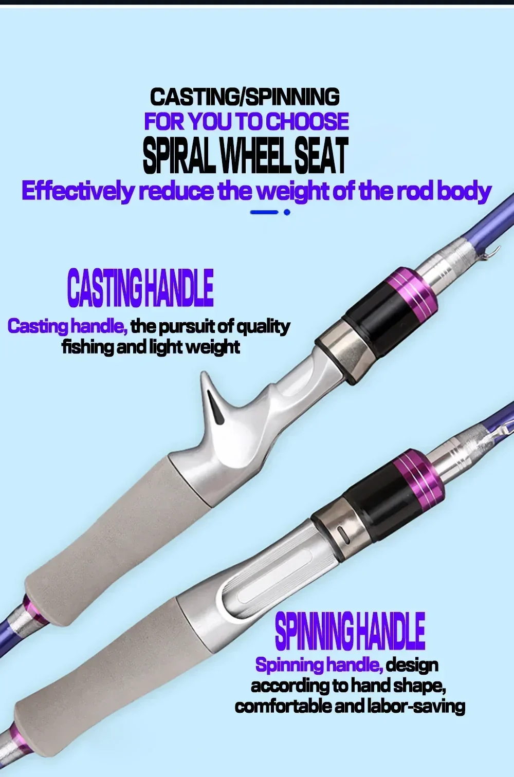 Color: Púrpura/amarilloMango: fundición (con gancho)/hilado (sin gancho)CaracterísticasPuntas sólidas de 2,25mmEl peso del señuelo es de 3G-20G, aplicabilidad más amplia.Cerámica de alta resistenciaLa guía está equipada con cerámica de alta resistencia, que es más suave y duradera que las guías normales.Varilla de carbono de dos seccionesCuerpo de fibra de carbonoFibra de carbono de alta densidad, el proceso de bobinado cruzado de tela de fibra de carbono de alta densidad hace que la caña sea más fuerte y más antitorsión, y no es fácil de romper al pescar peces grandes.Mango EVAHecho de material EVA de alta densidad, se siente mejor y se puede usar durante todo el año en agua dulce.El paquete incluye1 x caña de pescar(No incluye el carrete de pesca ni el soporte para caña)