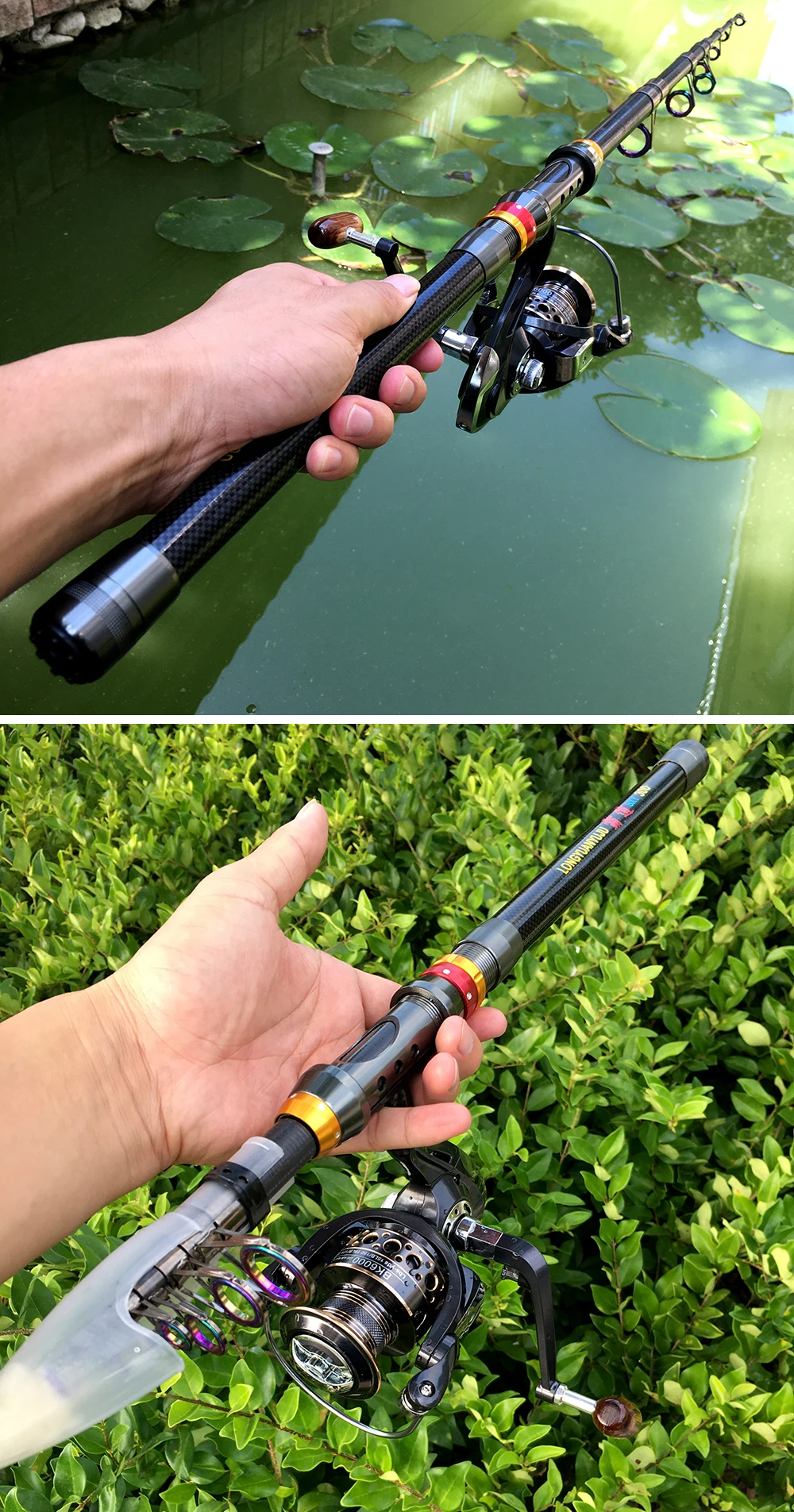 1. Esta caña de pescar está hecha de fibra de carbono, fuerte y duradera.