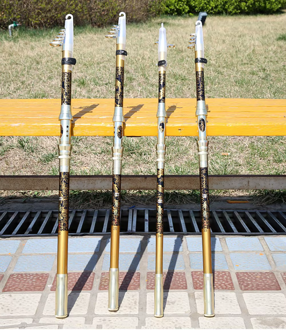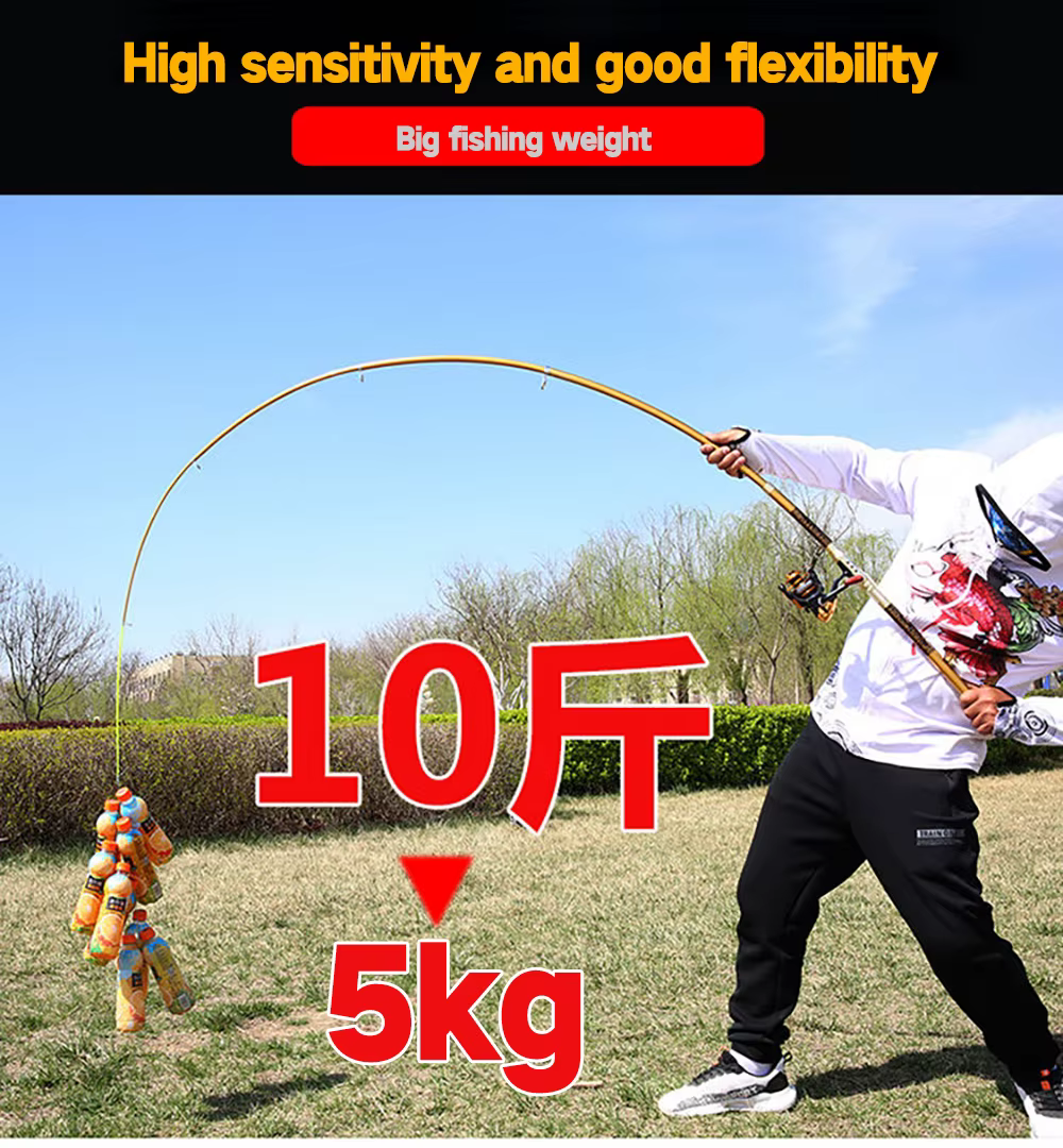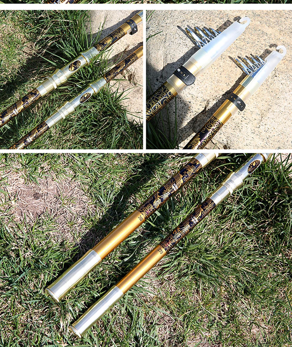Peces objetivo: carpa, besugo, tilapia y otros peces de agua dulceTamaño Longitud abierta real Longitud cerrada Secciones Diámetro superior Diámetro trasero Peso neto2,4 M 2,3 M 72CM 5 1,9 MM 19,9 MM 222G2,7 M 2,6 M 72CM 6 1,9 MM 21,4 MM 289G3,0 M 2,9 M 72CM 6 1,9 MM 21,4 MM 301G3,6 M 3,5 M 72CM 7 1,9 MM 25,1 MM 406G