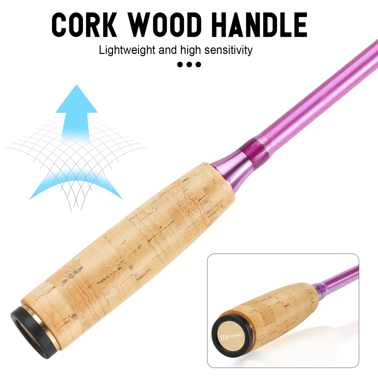 El mango de madera de corcho proporciona un agarre cómodo, lo que reduce la fatiga durante largas sesiones de pesca.
