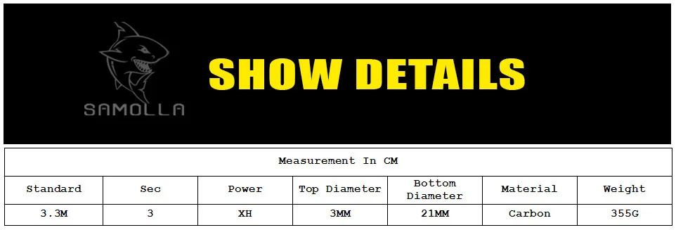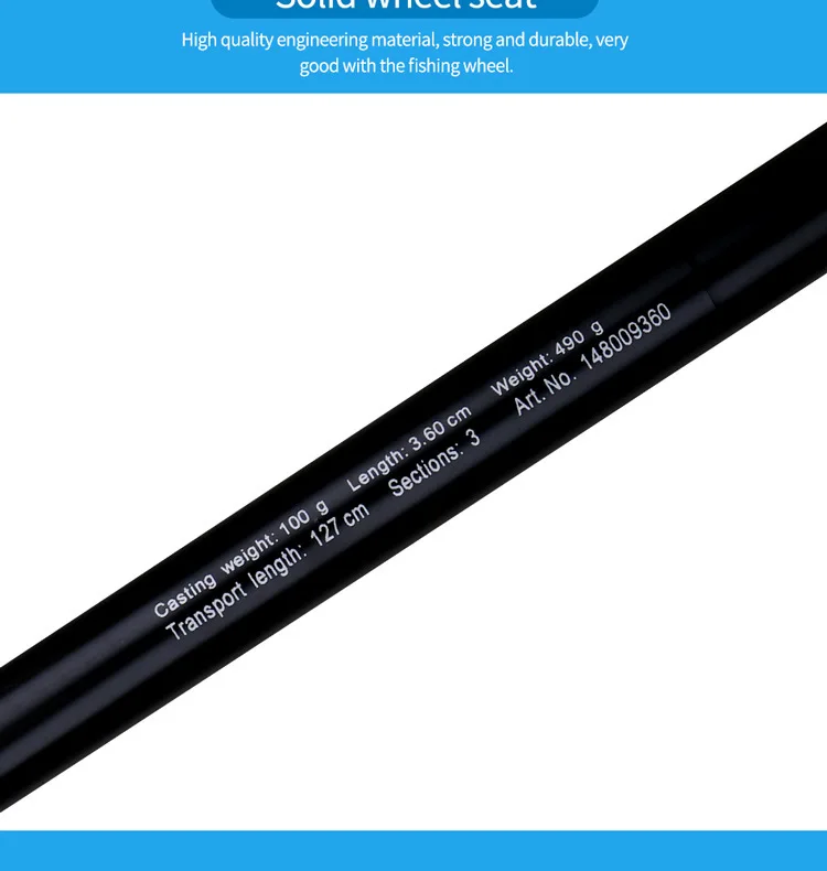 Descripción 1. Tipo: varilla giratoria varilla de fundición varilla de mosca varilla de barco 2. Longitud: 3,3 M 3. Longitud cerrada: 115cm 4.SEC: 3 5. Potencia: H 6. Diámetro superior: 3mm 7. Diámetro inferior: 21mm 8. Material: carbono 9. Mango: spinning 10.Material: poste de alto carbono con mango EVA 11. Caña giratoria adecuada para carrete giratorio. 12. de la línea Peso: 6 -45LB 13. Peso del señuelo: 7-105G El paquete incluye: 1 x caña de pescar (sin carrete) Nota: Sobre el peso y la longitud tal vez haya algunas diferencias. Este enlace solo tiene una varilla, sin carrete. Por favor prevalezca en especie para toda la información, ¡Gracias!