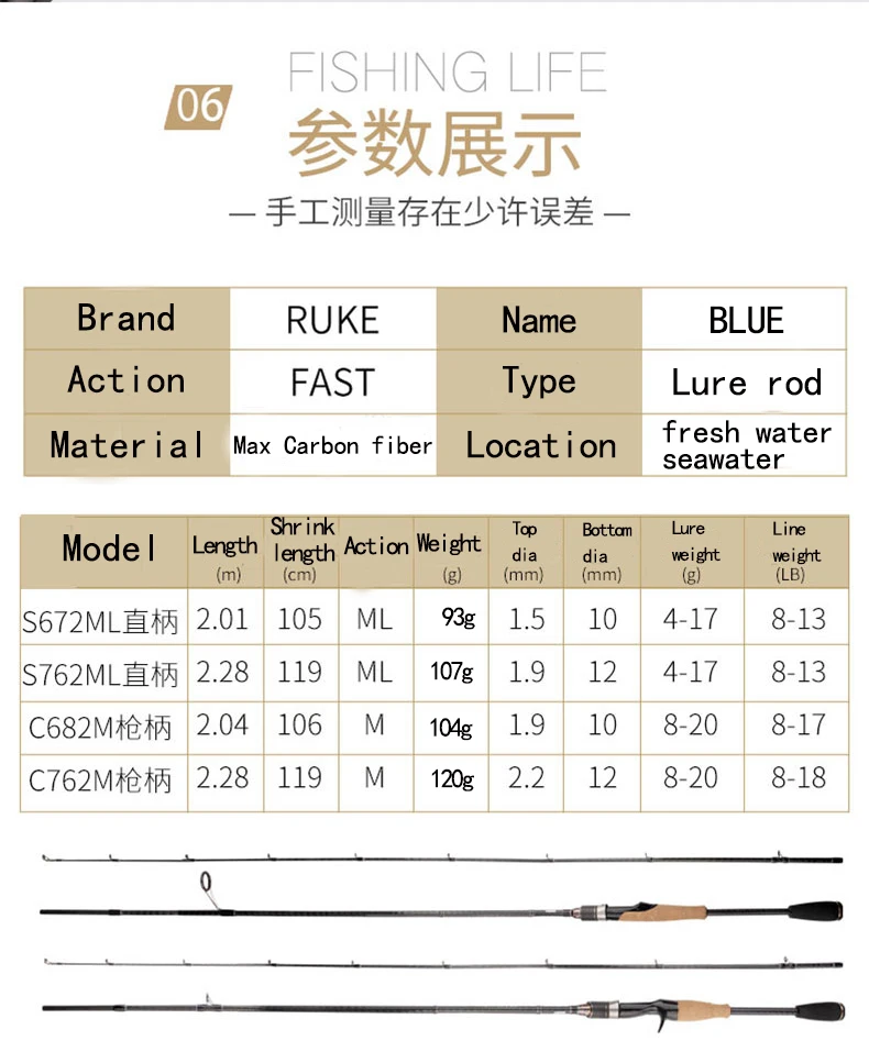 model: Length Shrink Length Top Dia Butt Dia Weight Lure Weight Line#