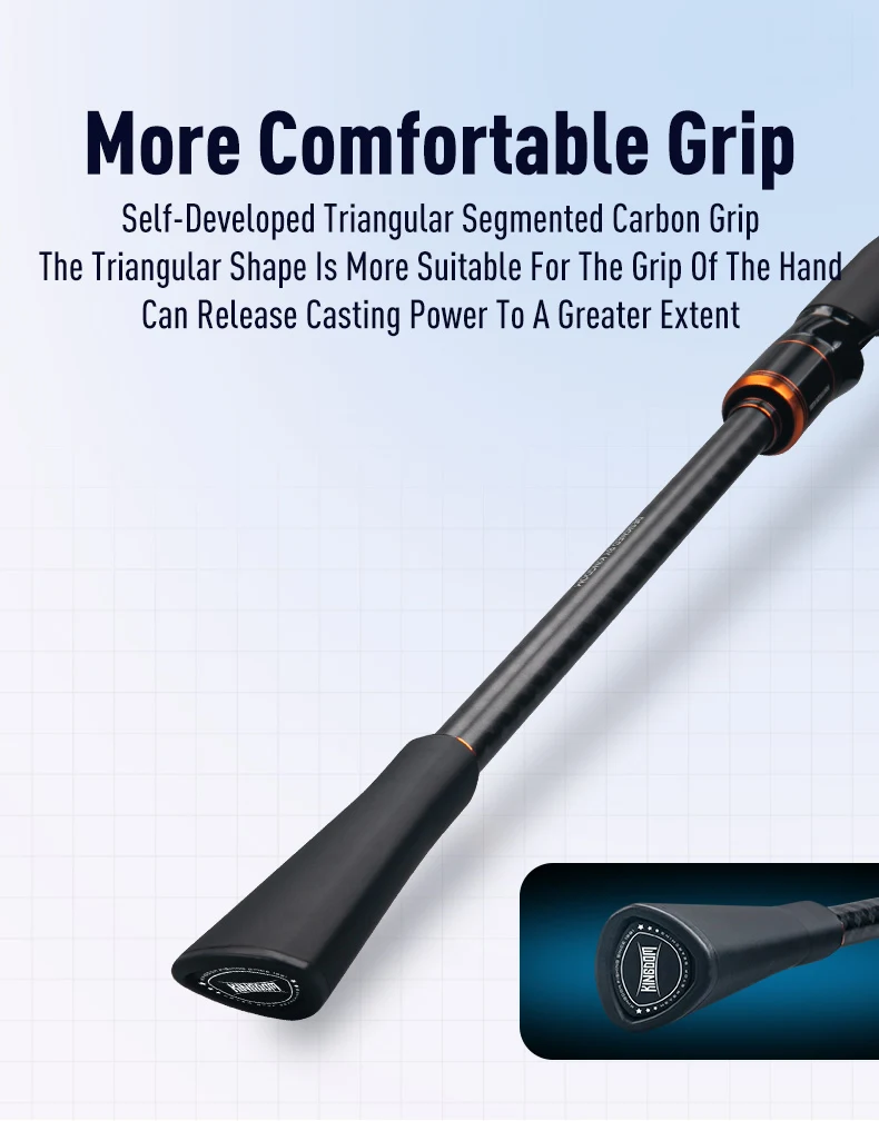 El agarre triangular dividido de carbono de desarrollo propio se adapta cómodamente a la mano, lo que garantiza un control preciso y mejora la potencia de lanzamiento, reduciendo la fatiga durante largas sesiones de pesca.