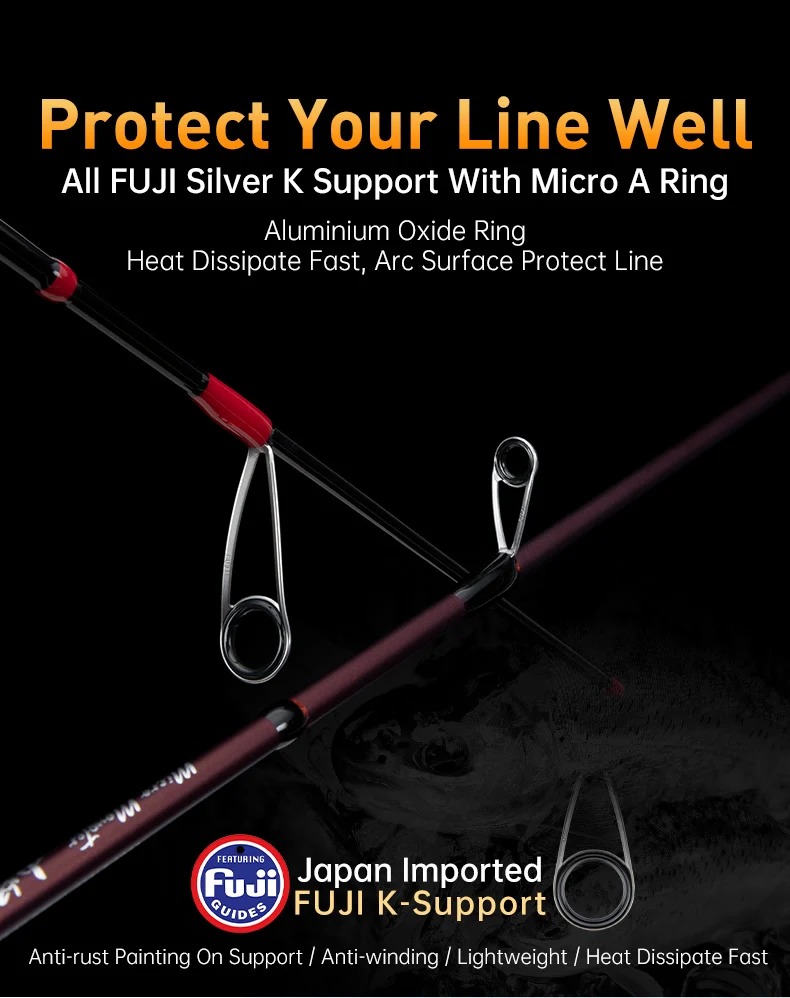 3. ¡El anillo magnético de óxido de aluminio disipa instantáneamente el calor y la superficie curva evita daños en la línea!El lanzamiento es suave como la seda con carretes giratorios y de respiración de agua.¿Rotura de línea?¡Nunca!El anillo guía prácticamente elimina la presión de la línea, aumentando la distancia de lanzamiento en un 50%, dejando temblando los peces del otro lado del arroyo.