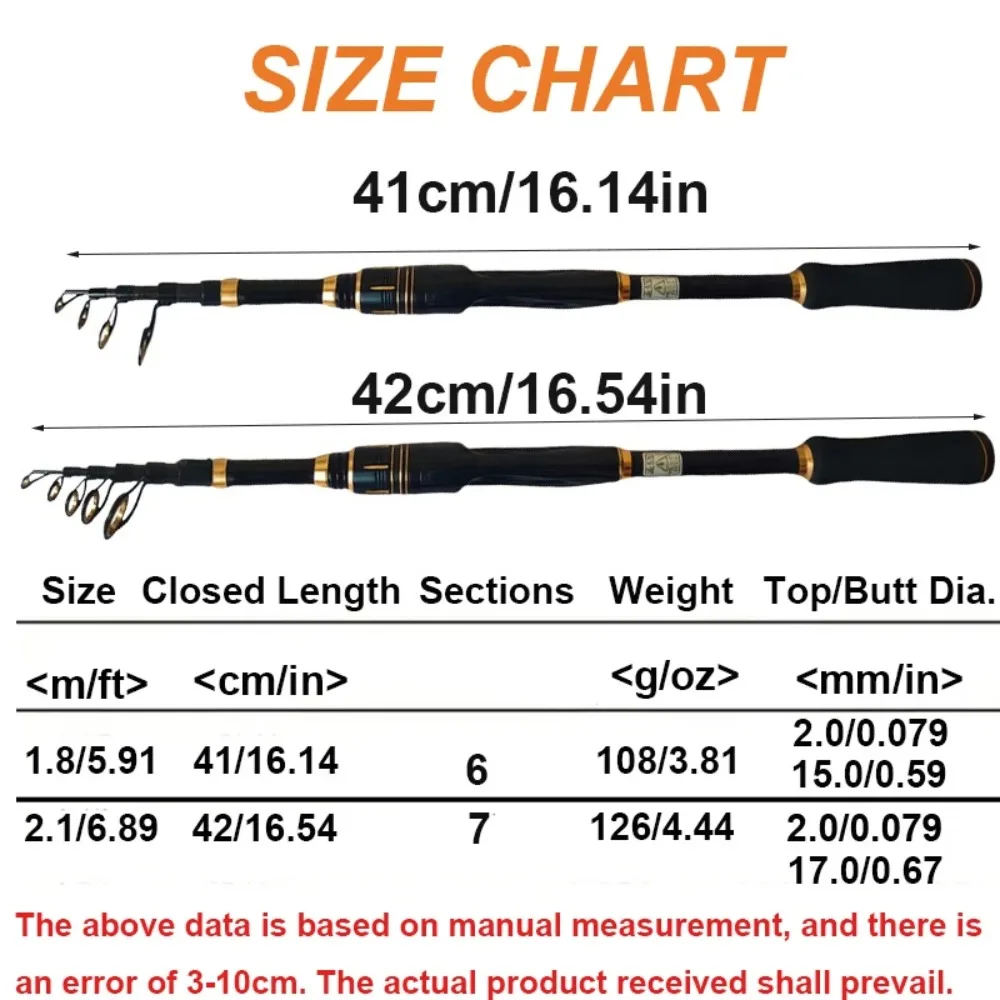 Información básica Tipo de caña: caña de pescar con señuelo telescópico Tonalidad: Duro Tamaño: 1,8/2,1 M Secciones: 6/7 Secciones Longitud cerrada / Característica: Corto y fácil de llevar. Adecuado para ríos/ladillos/réservoes/playa