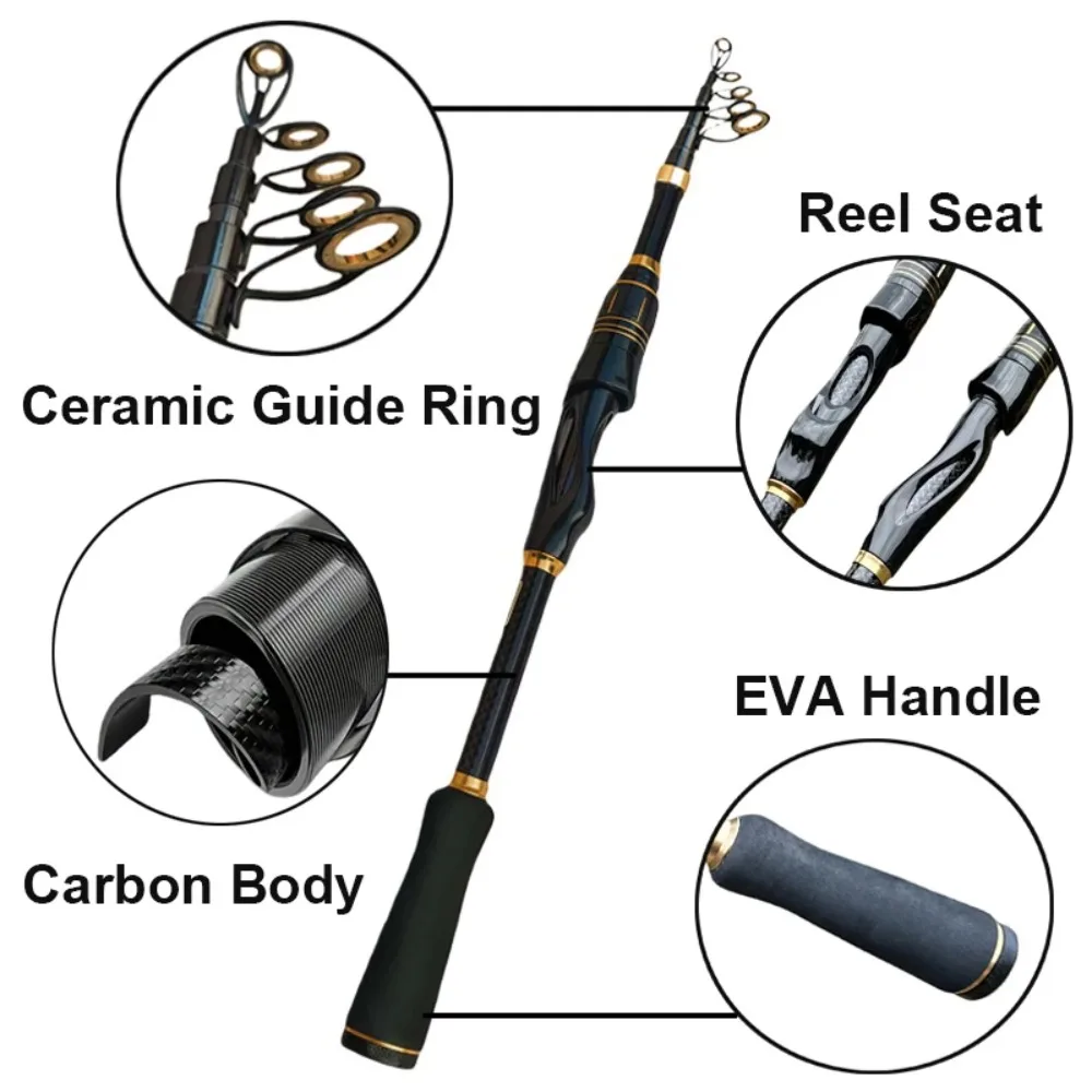 Características 1, cuerpo de varilla recto y fuerte. 2, caña de pescar telescópica súper corta, fácil de llevar. 3. Cubierta protectora de varilla duradera. 4, anillo de acero inoxidable, alta densidad, anticorrosión y fuerte disipación de calor.Diseño de anillo más grande, movimiento de línea suave y anticolisión.
