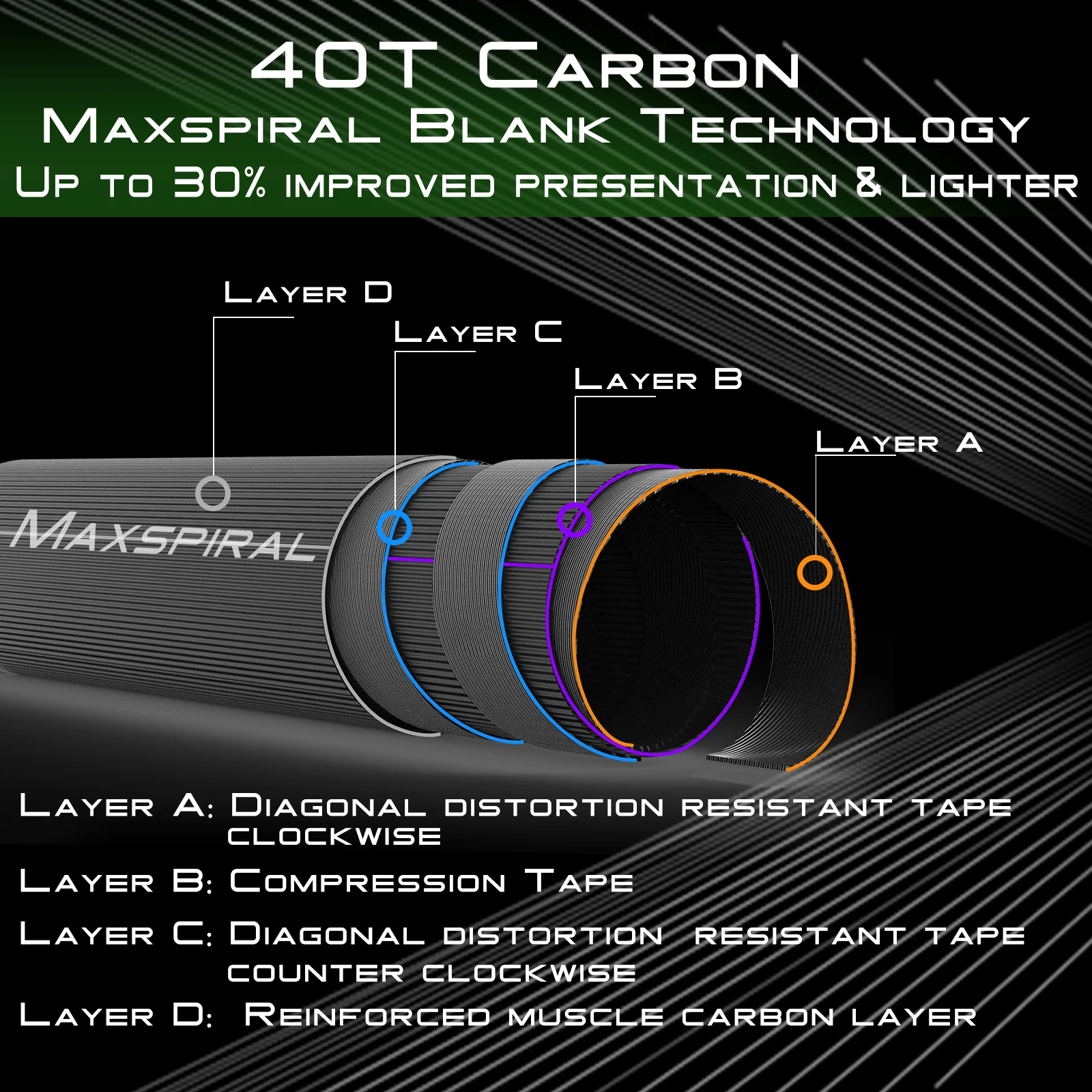 --Fibra de carbono de alto módulo IM12/40T para un peso ligero pero aún potente para lanzamientos de larga distancia.