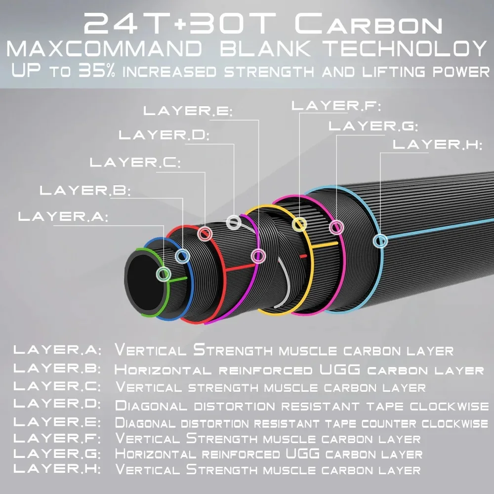 *****TECNOLOGÍA EXCLUSIVA DE BLANK MAXCOMMAND - Fibra de carbono 30T mixta pura de 24T.Con 7 capas mixtas de carbono que incluyen una capa de carbono Músculo Reforzado para al menos un 25 % de mayor rendimiento de lanzamiento.Una variedad de cañas incluso incluyen las versiones de viaje que son fáciles de guardar en la mochila.