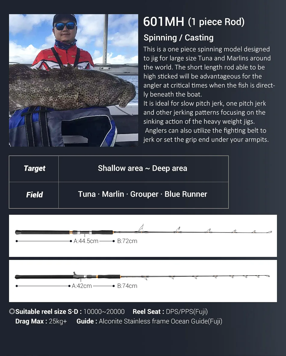 Este es un modelo de spinning de una pieza diseñado para jig para atum y marlins de gran tamaño en todo el mundo.La caña de longitud corta que se puede pegar en alto será ventajosa para el pescador en momentos críticos en que el pez esté directamente debajo del barco.