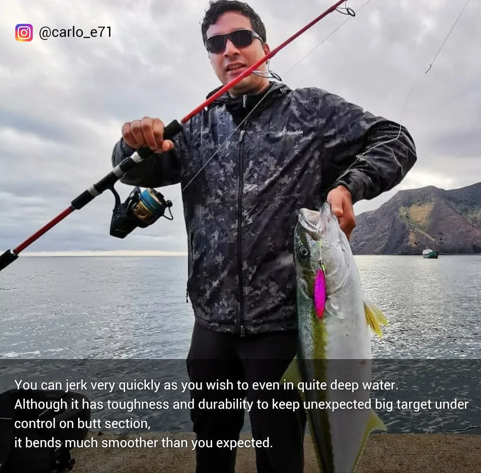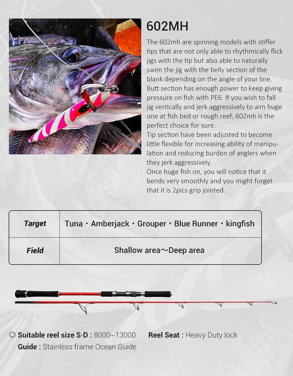 Este 602 m está diseñado para jigging vertical para apuntar a Kingfish y Amberja de gran tamaño.Podrás tirar con un tono alto en un trazo corto o un trazo largo con una sensación de nitidez.Está diseñado para jigging verticalmente, por lo que una vez que el ángulo de la línea es demasiado agudo, puede hacer que la plantilla pierda la tensión.