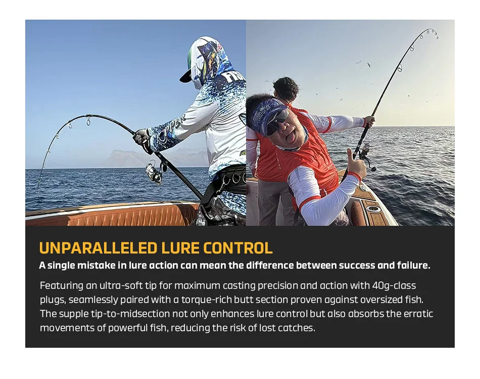 Featuring an ultra-soft tip for maximum casting precision and action with 40g-class plugs, seamlessly paired with a torque-rich butt section proven against oversized fish. The supple tip-to-midsection not only enhances lure control but also absorbs the erratic movements of powerful fish, reducing the risk of lost catches.