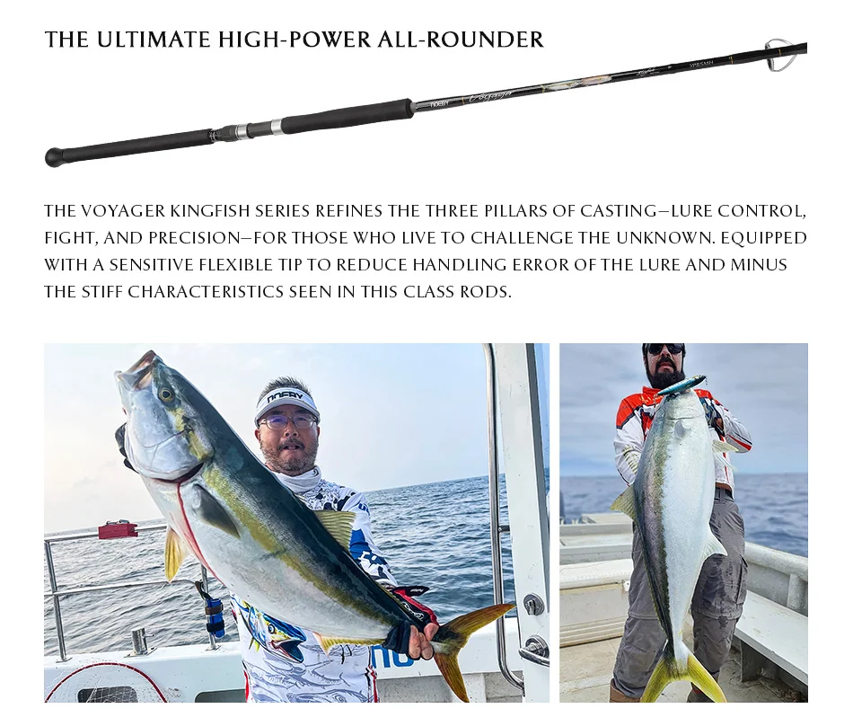 The Voyager Kingfish series refines the three pillars of casting—lure control, fight, and precision—for those who live to challenge the unknown. Equipped with a sensitive flexible tip to reduce handling error of the lure and minus the stiff characteristics seen in this class rods.