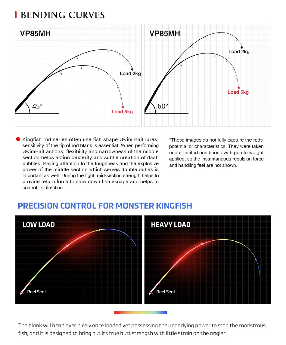 The lightness of the rod will allow anglers to cast all day and makes it ideal for fishing with topwater diving stickbaits, as it’s equipped with a sensitive, flexible tip to reduce handling error of the lure. The blank’s followability is extremely high, and the bending point shifts toward the angler as soon as a large fish runs, designed to bring out true butt strength with minimal strain on the angler. Furthermore, the rod’s length helps you make long casts to feeding kingfish.