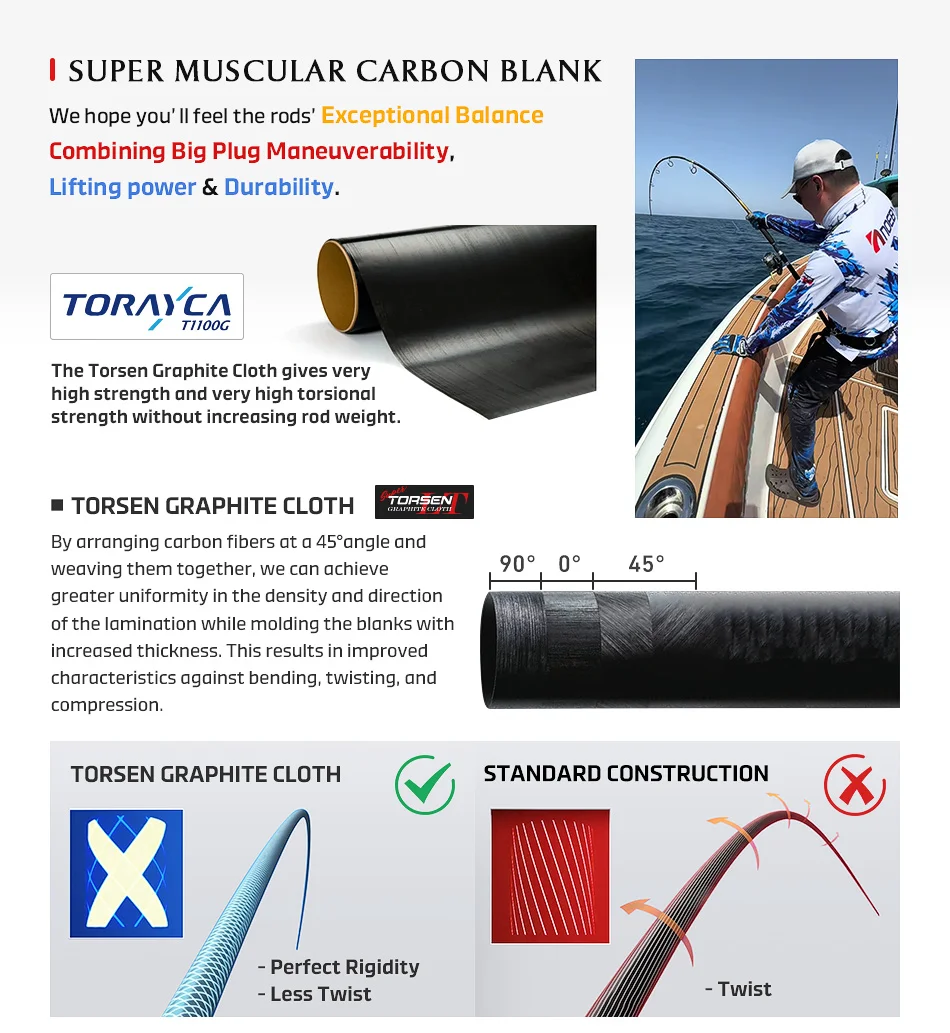 La serie de cañas de atún utiliza a menudo Stickbaits y Poppers grandes, por lo que la sensibilidad del espacio en blanco es esencial al realizar operaciones con señuelos, mientras que el diseño de la sección media debe considerar el manejo de potencia y la fuerza. Durante la lucha, la fuerza de la sección media proporciona fuerza de retorno para ralentizar el escape de los peces y ayuda a controlar su dirección.