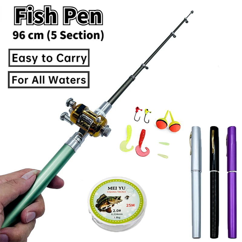 Caña de pescar de aleación de aluminio con forma de bolígrafo de bolsillo portátil de alto rendimiento 96cm + carrete de cebo con combo de accesorios de línea【Información básica】Caña de pescarMaterial: carcasa exterior de aluminio + varilla interna de fibra de vidrioDiámetro: 1,5 cmLongitud plegada: 20,5 cmLongitud de estiramiento: 96 cm (5 secciones)Peso: 55gColor: oro/plata/rojo/azul/negro/púrpura/verdeCarrete mini tamborMaterial: plásticoColor: doradoTamaño: 6,5 cm x 4cm x 3cmCapacidad de la línea: 0,18mm/60m, 0,20mm/50m, 0,25mm/40mRelación de engranajes: 2,1: 1Peso: 30gAplicación: pesca en balsa, pesca en hielo, pesca en barco, pesca en Puente, etc., pero no para lanzar【Características】1: Caña de pescar del tamaño de un bolígrafo para situaciones en las que el equipo de pesca de tamaño completo es incómodo.2: El carrete se fija entre 2 ranuras en el cuerpo del bolígrafo.3: Es portátil, compacto, ligero y fácil de usar.4: Adecuado para pescar desde un barco, una presa o en hielo.5: Cuerpo compacto y ligero que cabe en el bolsillo, guantera, maletín, mochila, etc.6: Regalo ideal para entusiastas de la pesca o coleccionistas.【Lista de paquete】1 x Caña de pescar