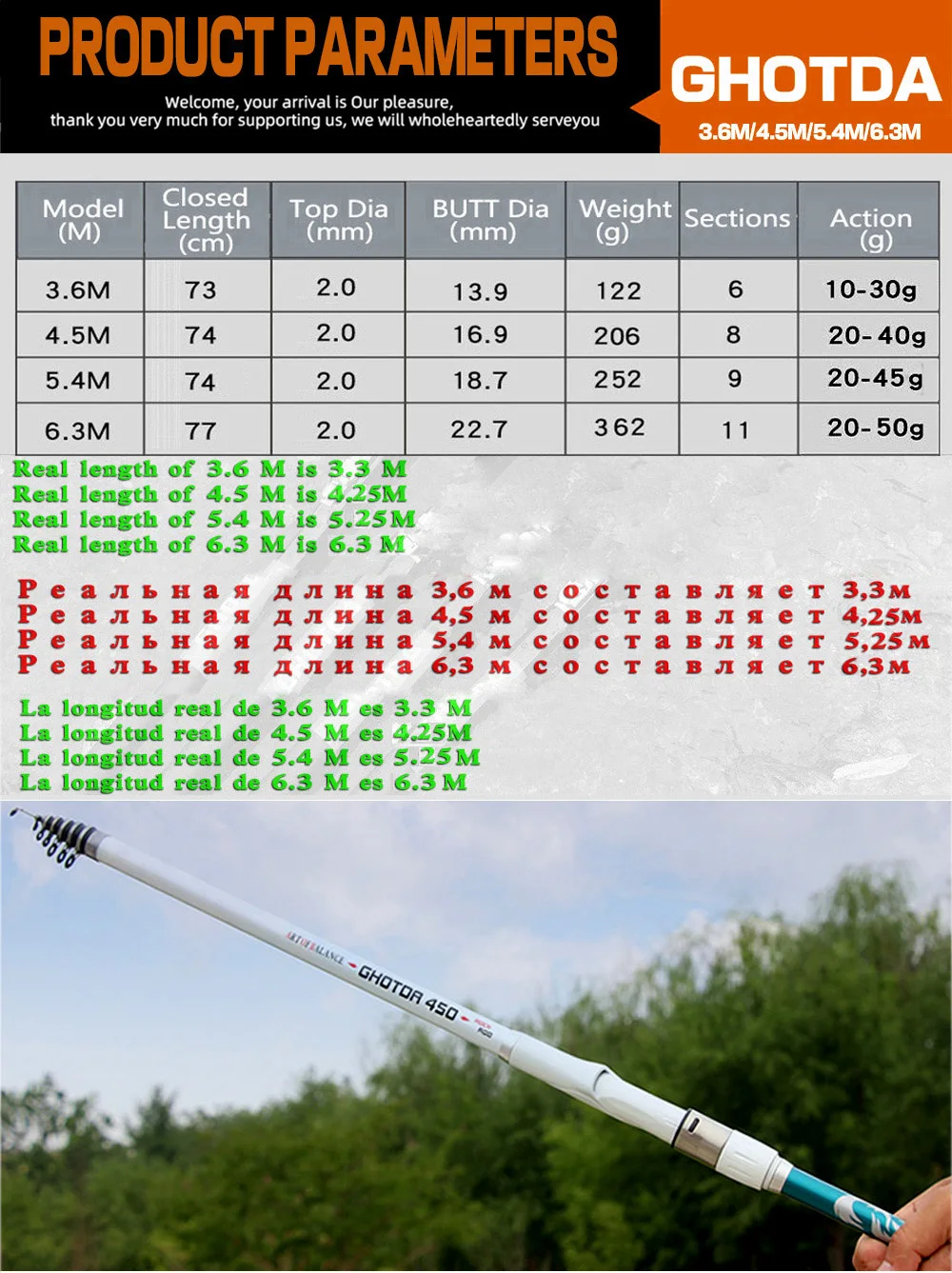 Caña de pescar en roca de fibra de carbono completa 3,6 M/4,5 M/5,4 M/6,3 M