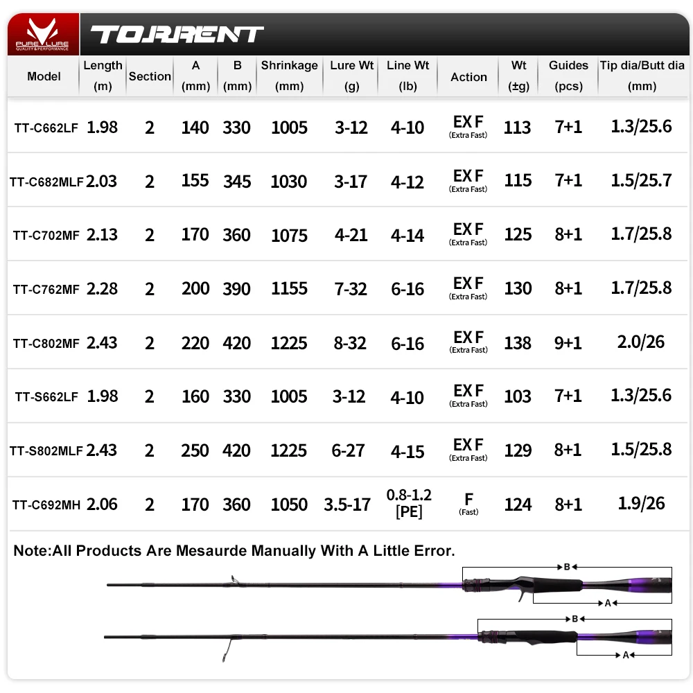 Caña de pescar PURELURE púrpura resistente, 1,98 m, 2,03 m, 2,13 m, 2,18 m, 2,43 m L/ML/M/MH, anillo guía Fuji Toray 30T + 40T, tela de carbono, pez lubina