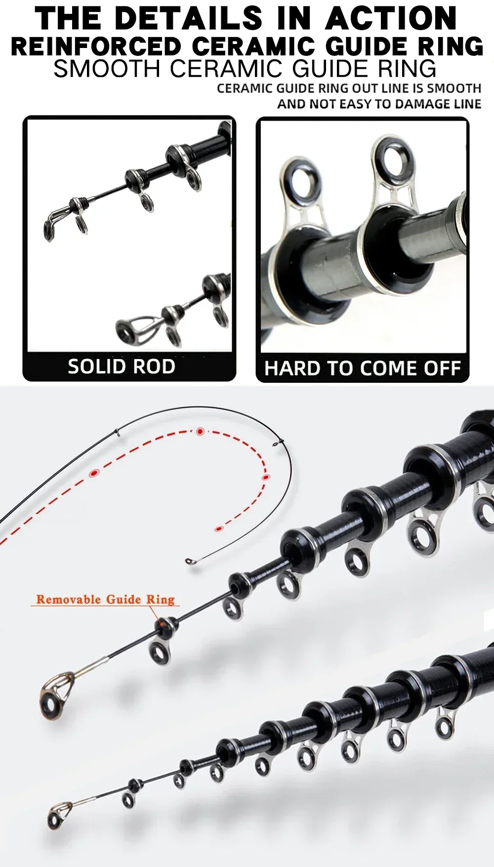 Ojo guía de cerámica, por lo que es suave y no daña el hilo de pescar.Y está equipado con un anillo guía móvil para evitar que la punta se rompa.
