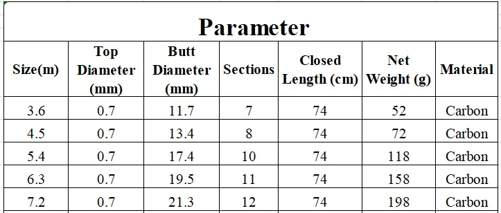 Longitud: 3,6-7,2 m Longitud cerrada: 74 cm