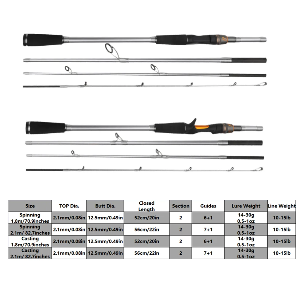 Caña de pescar con señuelo de 4 secciones, 1,8 M, 2,1 M, Spinning/Casting, MH Power, fibra de carbono, peso del señuelo 14-35g
