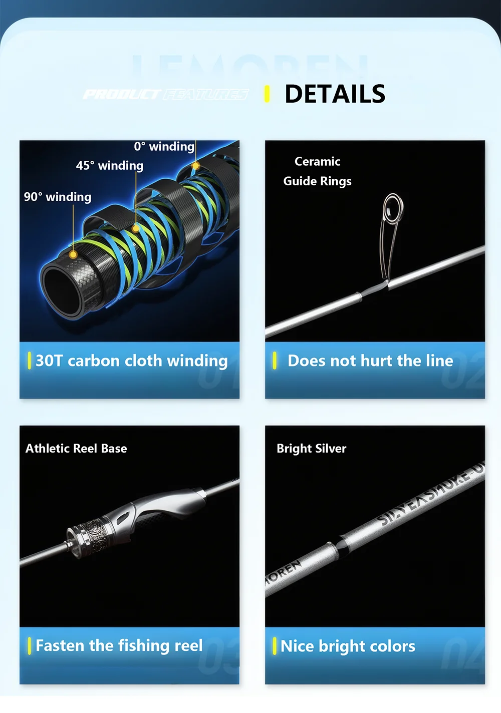* Material: fibra de carbono 30T (90°, 45°, 0°, Tela de carbono cruzada de 3 direcciones para mejorar la elasticidad y durabilidad de la caña de pescar)