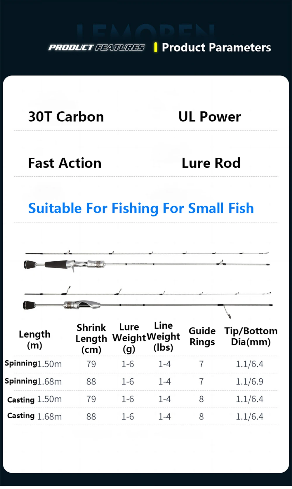 * Longitud de la varilla 1,5 m / Longitud retráctil 79 cm / Peso de la varilla 68 g (0,15 lbs) / Peso del cebo 1-6 g (0,21 oz) / Diámetro de la punta 1,1 mm / Diámetro inferior 6,4 mm / 8 anillos guía