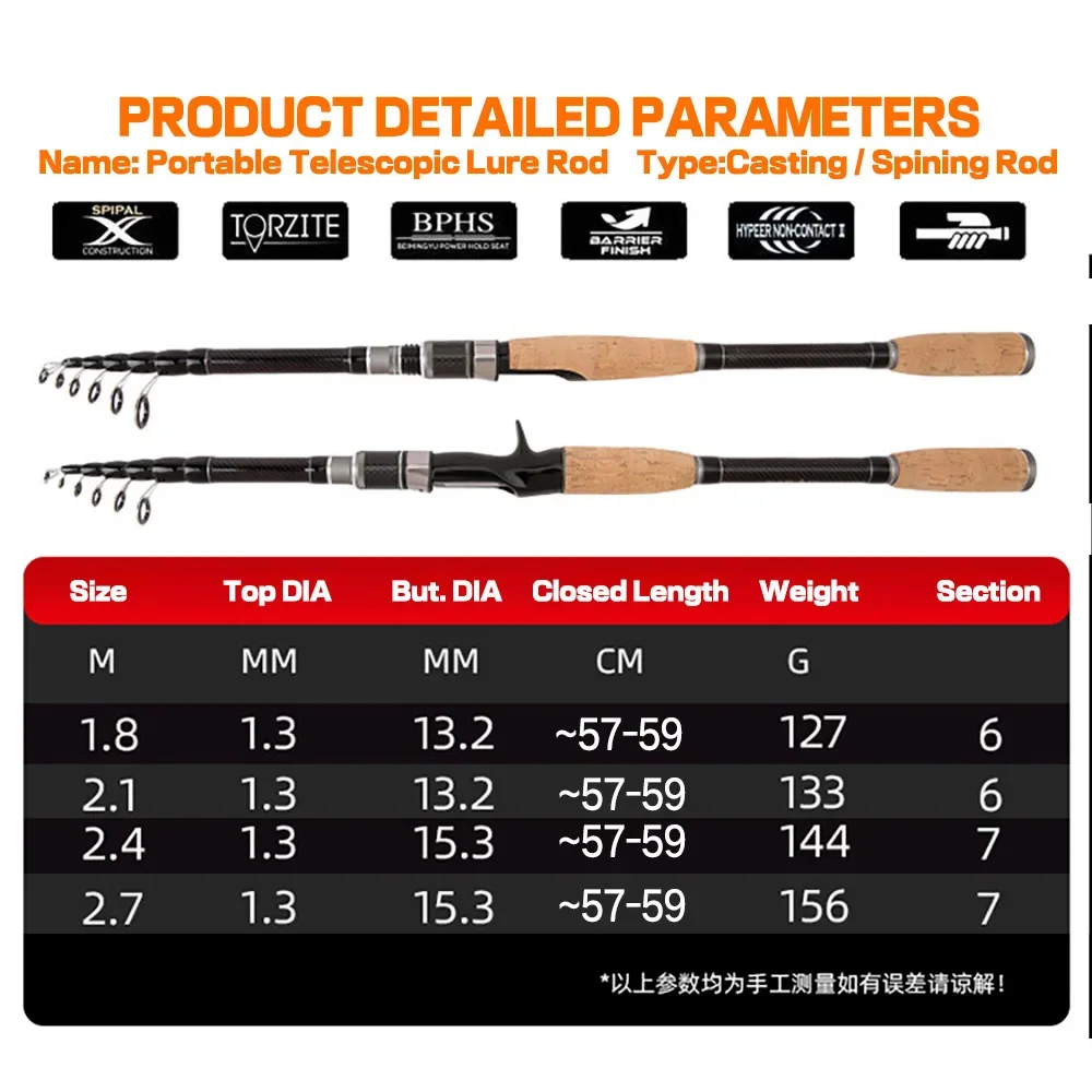 Telescopic Lure Fishing Rod 1.8M 2.1M 2.4M 2.7M High-carbon Baitcasting Pole Fast Action Closed Length 57~59cm for All Waters