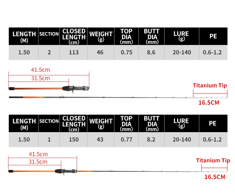 Caña de pescar de sepia Johncoo 1,5 m una sección con punta de titanio 43g caña de pescar de barco de fundición ligera