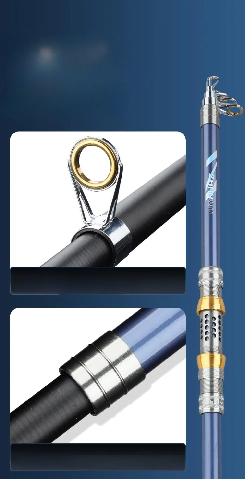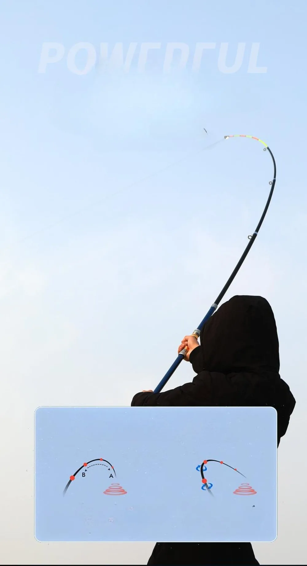 1. Esta caña de pescar está hecha de fibra de carbono y la tela de carbono de 7 capas no es fácil de romper, es fuerte y duradera.