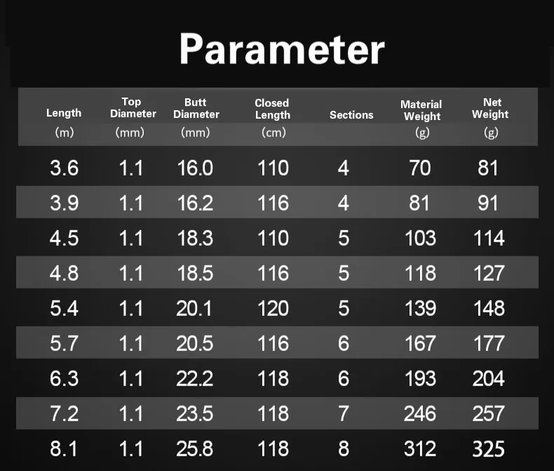 Longitud: 3,6-8,1 m Longitud cerrada: 110-120cm