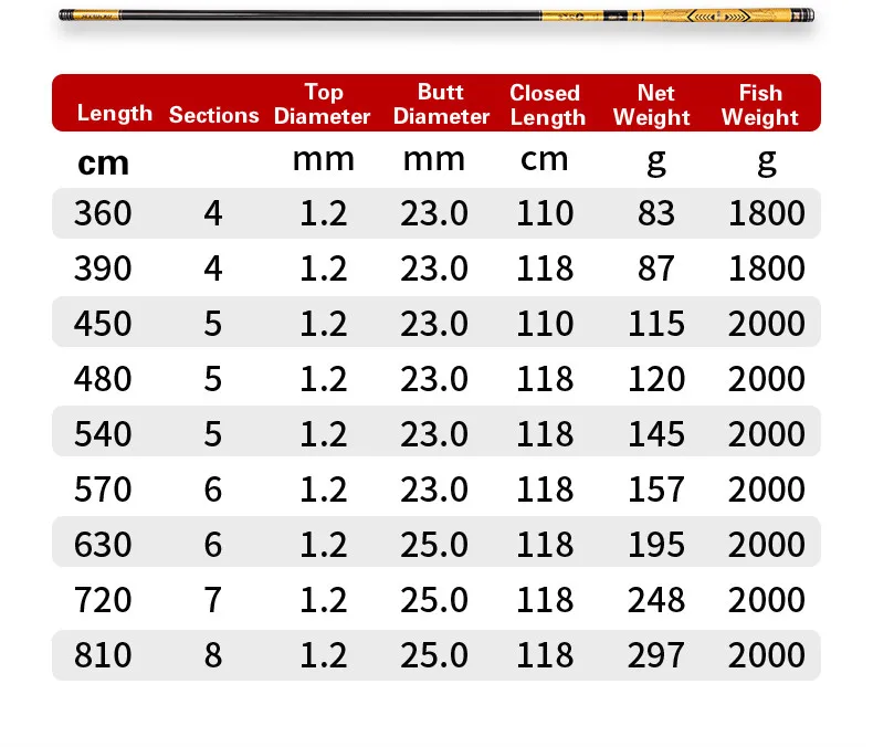 Longitud: 3,6-8,1 m Longitud cerrada: 110-118cm