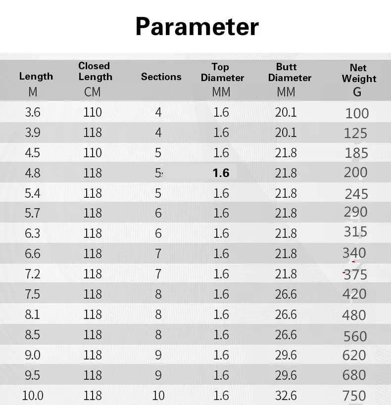 Longitud: 3,6-10m Longitud cerrada: 110-118 cm