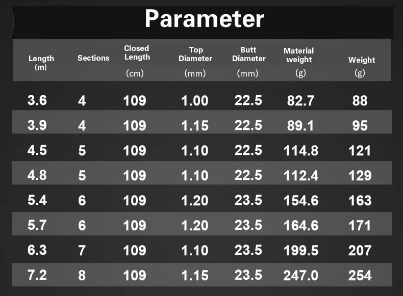 Longitud: 3,6-7,2 m Longitud cerrada: 109 cm