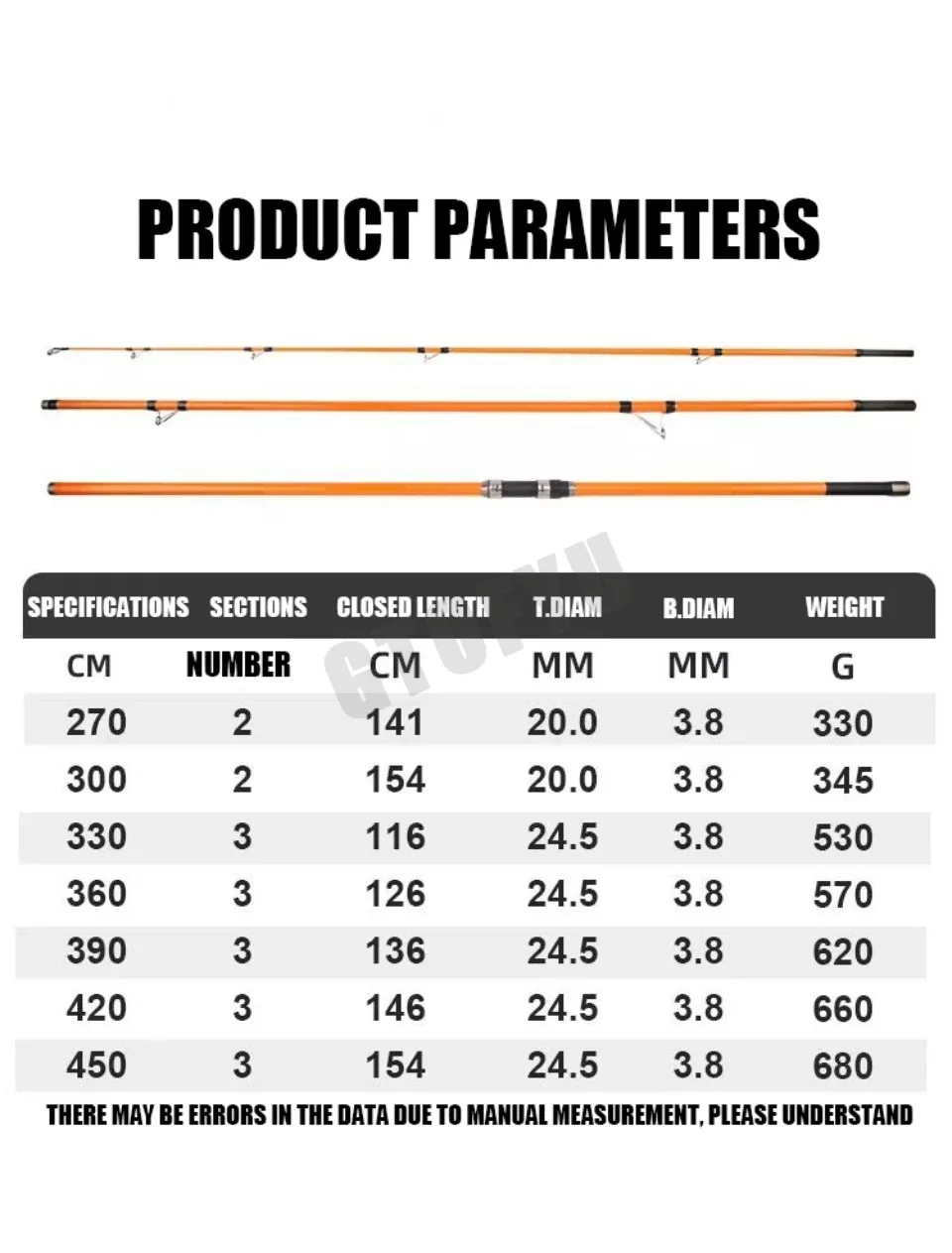 Especificación: 3 seccionesLongitud total: 3,3 M, 3,6 M, 3,9 M, 4,2 MPeso: 330 g, 570 g, 620 g, 660 gDiámetro superior: 3,8 mm, diámetro del trasero: 94,5 mmLongitud cercana: 116 cm, 126 cm, 136 cm, 146 cm