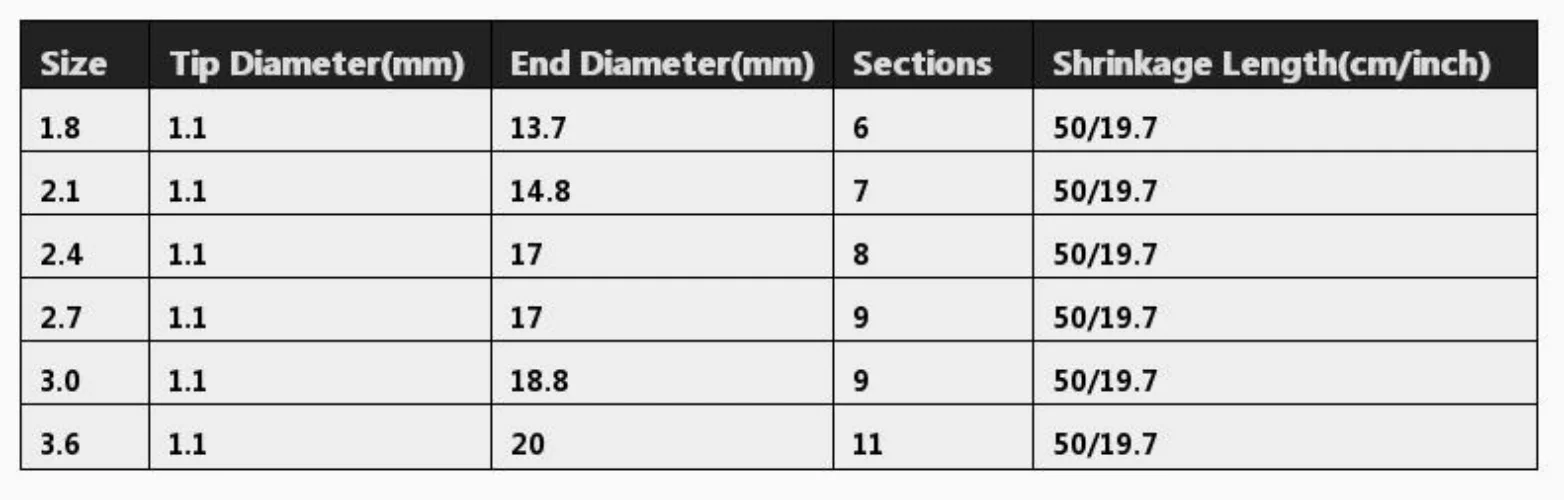 Tamaño, diámetro de la punta (mm), diámetro del extremo (mm), secciones, longitud de contracción (cm)