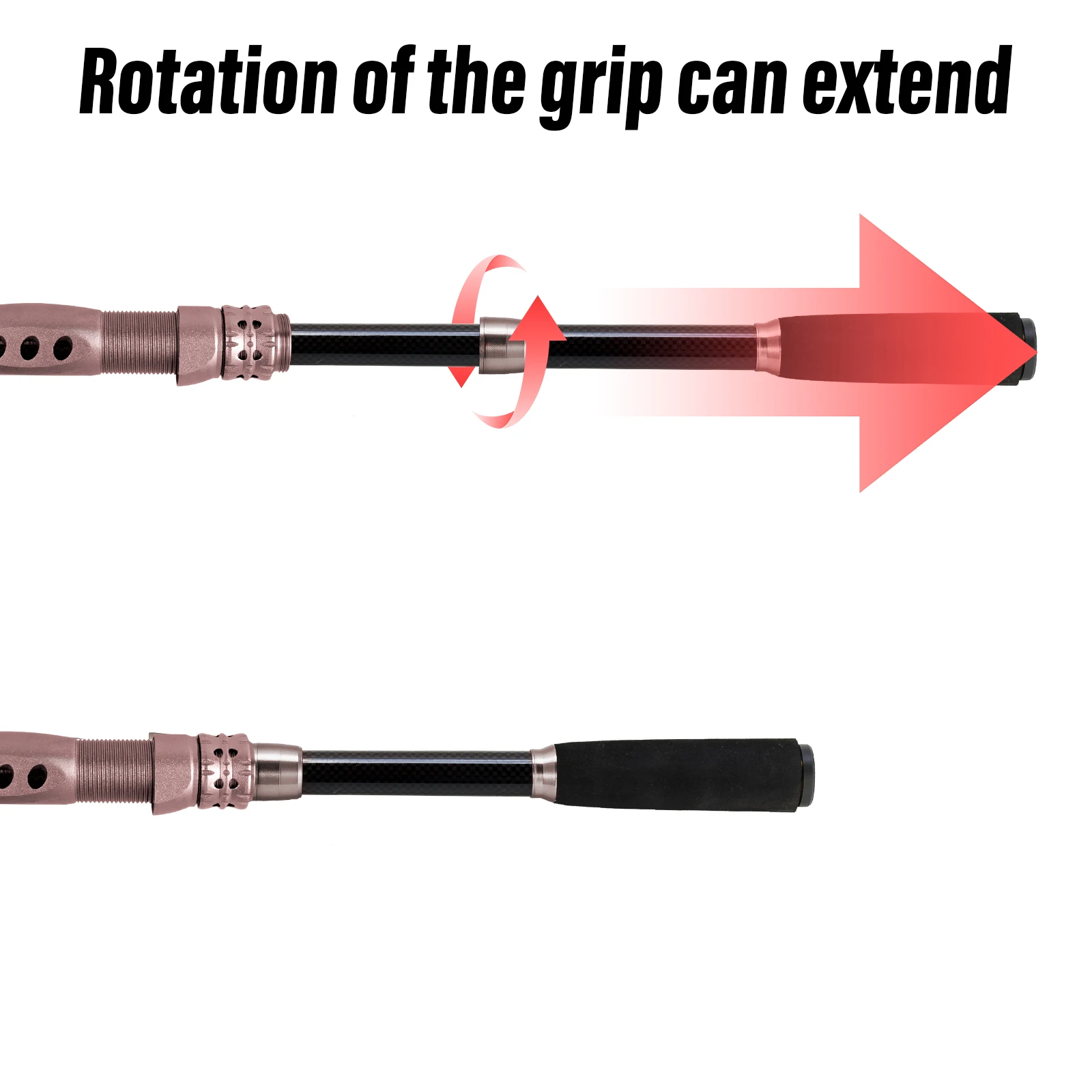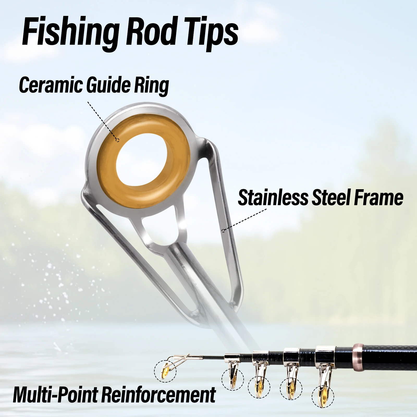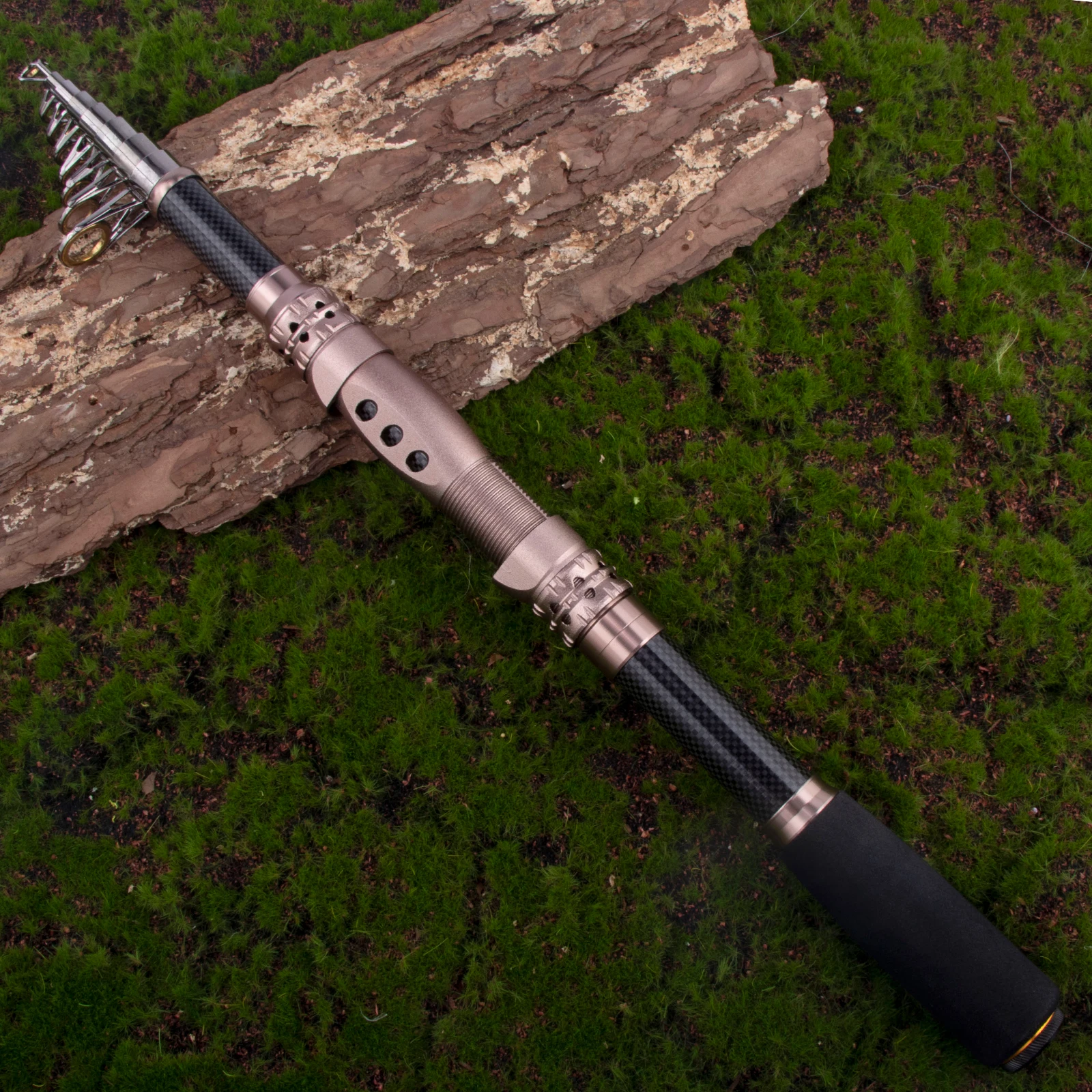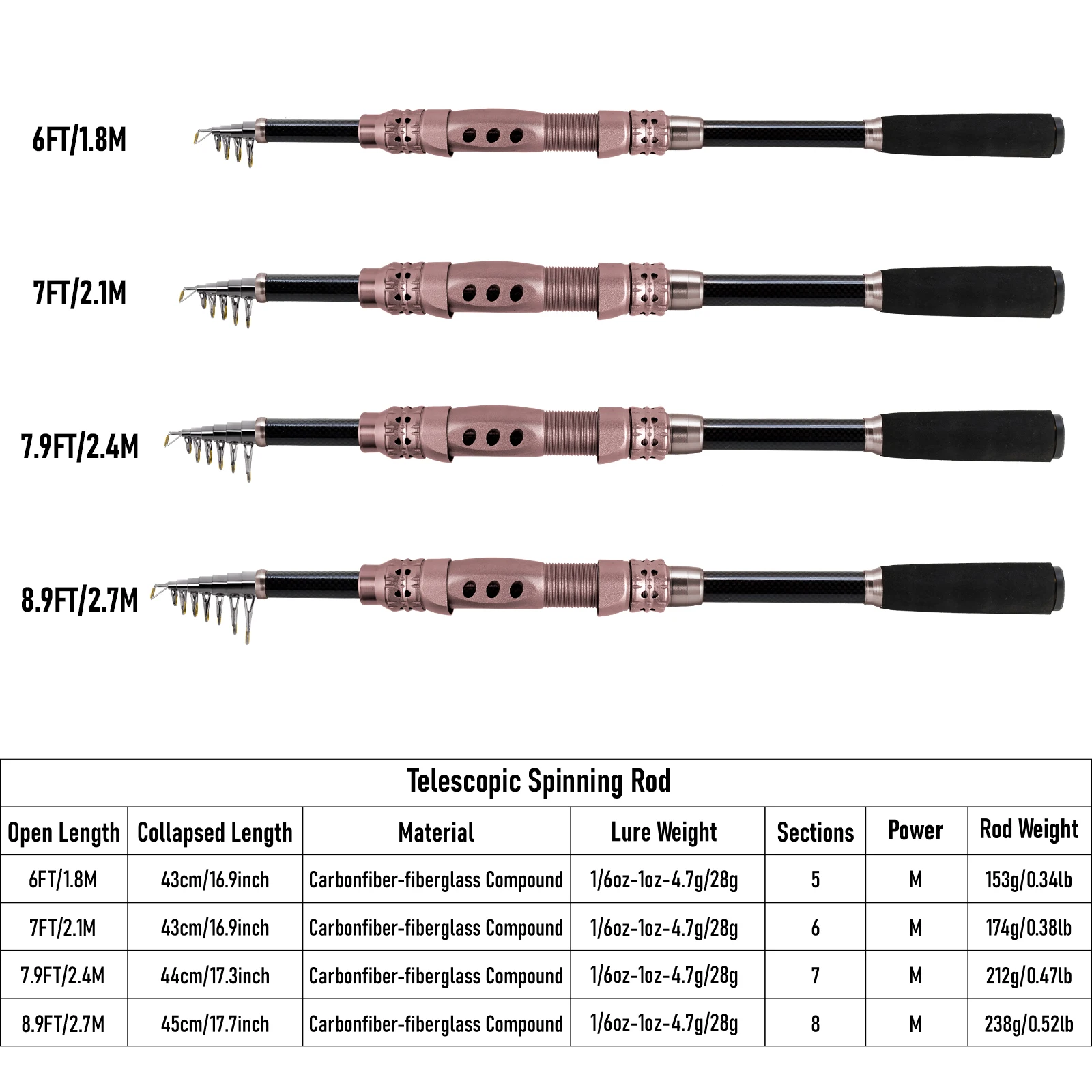 Caña de pescar telescópica portátil: la fibra de carbono de alto módulo combina piezas en blanco de fibra de vidrio, el marco de guías de acero inoxidable con un anillo de cerámica y el asiento del carrete de aluminio garantizan una gran funcionalidad y durabilidad.8,9 pies, acción rápida, potencia media, 1/6 oz-1 oz/4,7 g-28 g Peso del señuelo, 6-12 LB/2,7,54 kg Peso de la línea