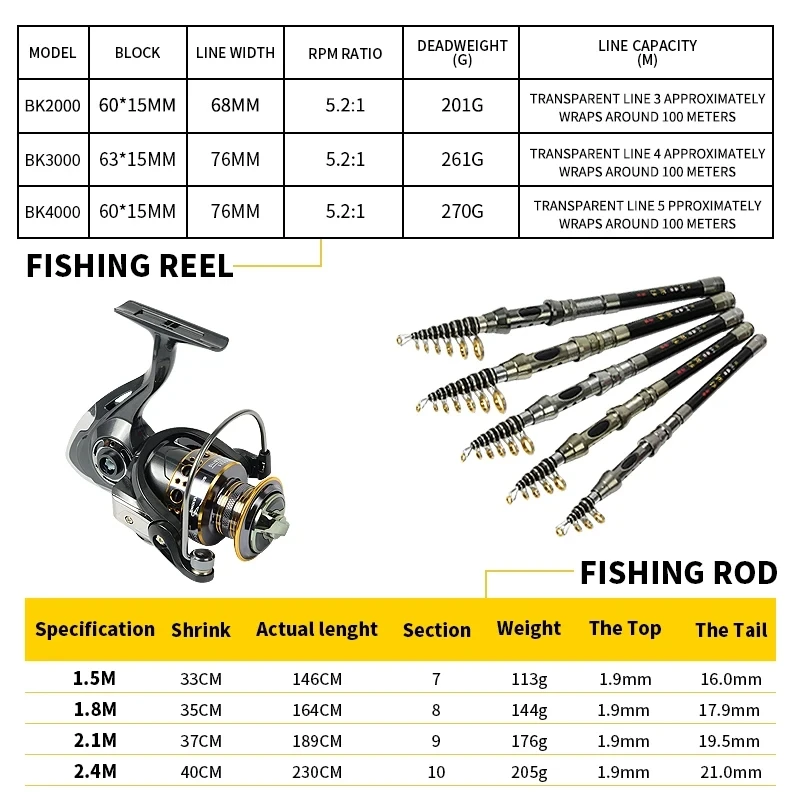 • Kits completos con caña de pescar telescópica y anzuelos de carrete giratorio Juego de postes de viaje: este kit completo incluye todo lo que necesita para un viaje de pesca exitoso, por lo que es una opción conveniente y práctica para los Pescadores de todos los niveles.