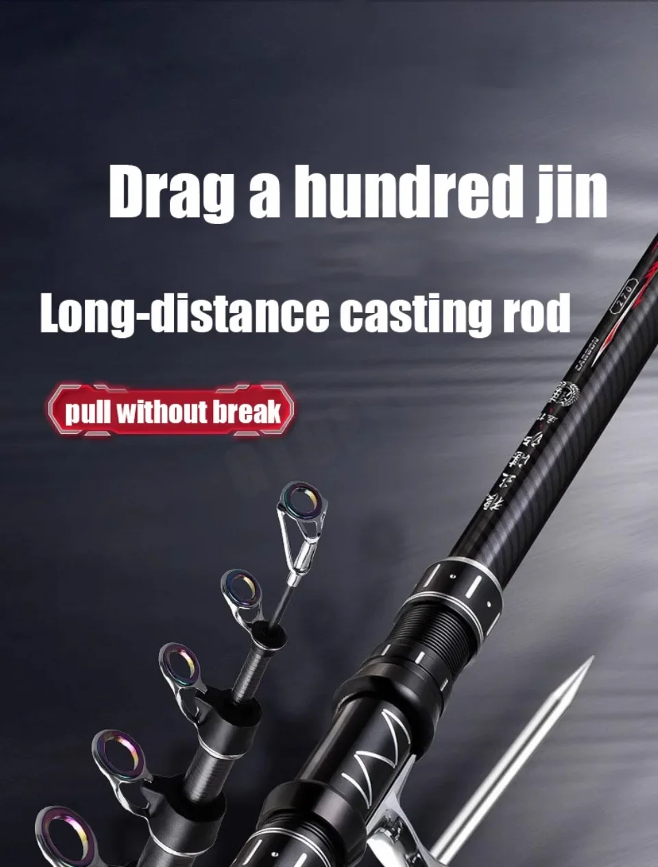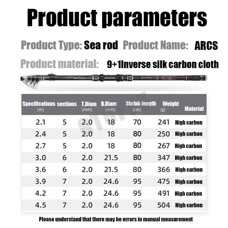 Señuelo W: 10-300 gMaterial: fibra de carbono + resina epoxiSecciones:5 5 6 6 7 7 7Longitud: 2,4 M 2,7 m 3,0 m 3,6 m 3,9 m 4,2 m 4,5 mPeso: 272g 275g 287g 374g 398g 510g 535g 555gLongitud cercana: 77 cm 77 cm 89 cm 89 cm 92 cm 92 cm 92 cm Señuelo: 10-300 g, Longitud: 1-2,5 M, Prueba: 20 kg arriba