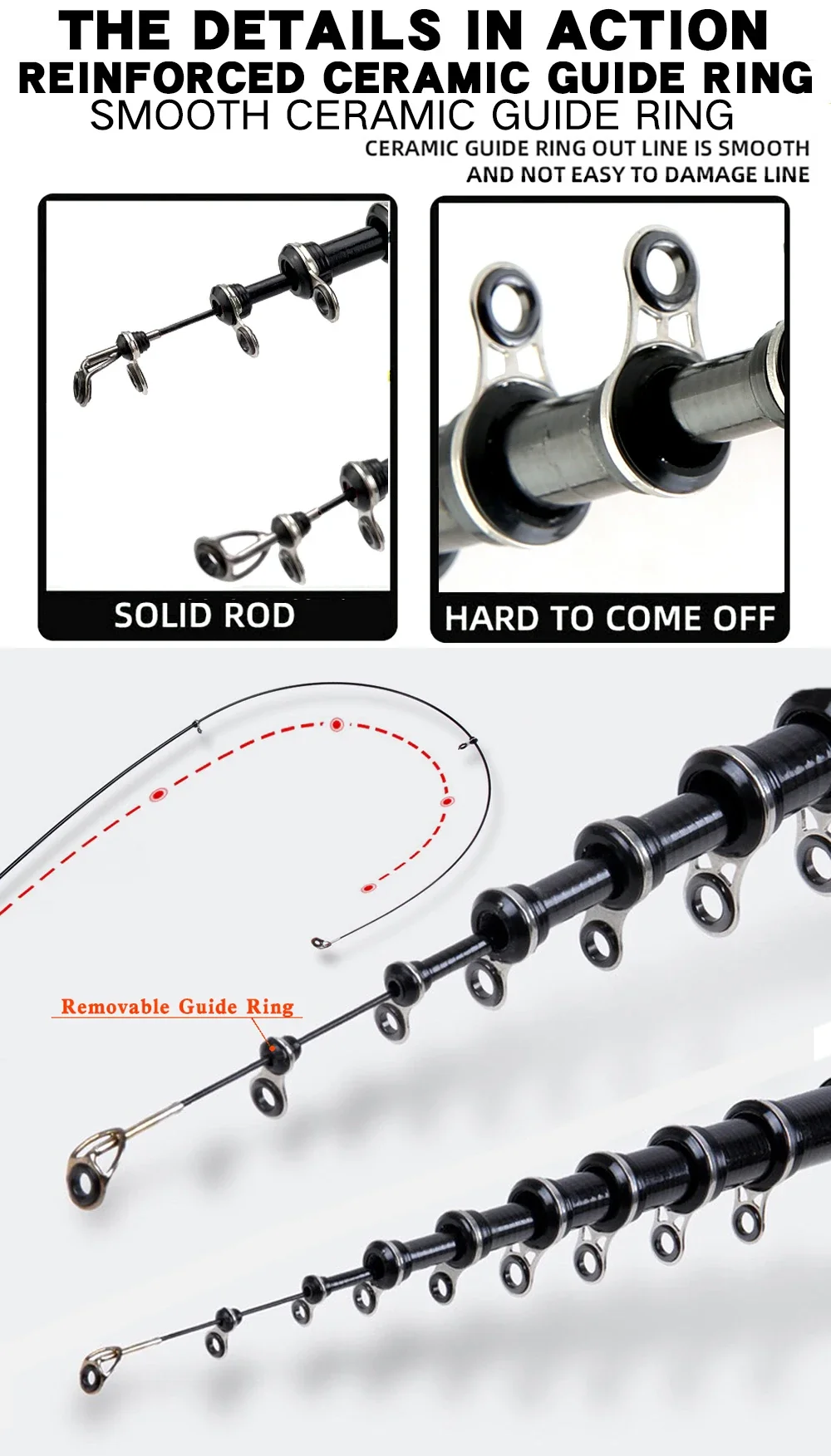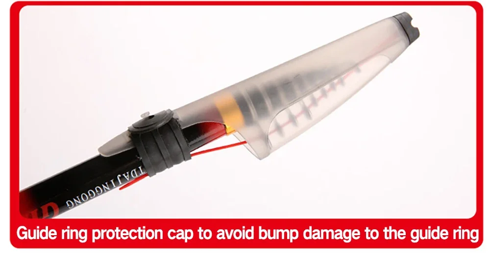 El anillo guía grande puede atravesar "hares espaciales" y otras ligaduras para garantizar que el hilo de pescar sea flexible y fácilmente maniobrable. Esta caña de pescar viene equipada con un anillo guía móvil que gira suavemente, evitando daños al hilo de pescar. Además, la tapa protectora de la guía garantiza que el anillo guía de la varilla no sea susceptible a lesiones o daños. ¡Compre esta fantástica caña de pescar y experimente la emoción de pescar como nunca antes!
