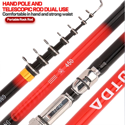 Caña de pescar telescópica de 2.7/3.6/4.5/5.4/6.3 M, caña de pescar de viaje de alto carbono, potencia de Spinning, caña de Baitcasting de lanzamiento de distancia de 10-50gPresentamos nuestra caña de pescar en roca de alta calidad fabricada con fibra de carbono de primera calidad, ¡perfecta para todas tus aventuras de pesca!Con su diseño giratorio telescópico, esta caña de pescar viene en una variedad de tamaños: 2,7 M, 3,6 M, 4,5 M, 5,4 M y 6,3 M, lo que la hace ideal para usar en diversos escenarios, incluidos estanques de embalse, océanos y pesca en roca..