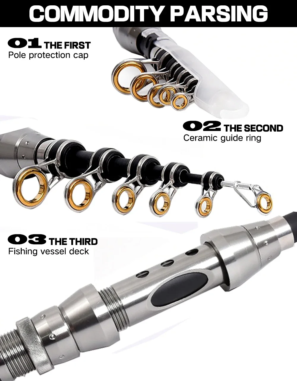 1. Esta caña de pescar está hecha de fibra de carbono, fuerte y duradera.