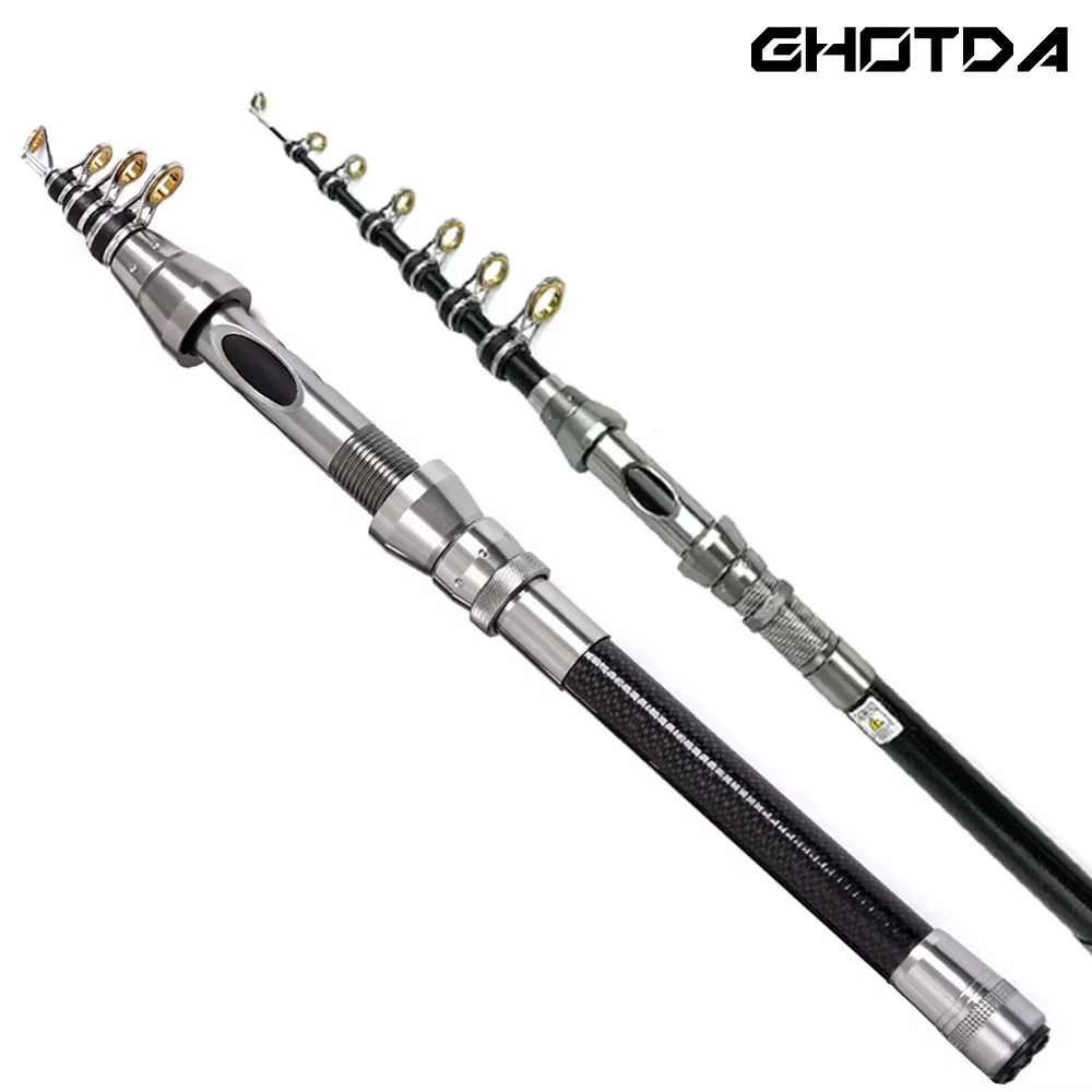 1. Esta caña de pescar está hecha de fibra de carbono, fuerte y duradera.