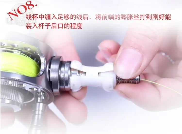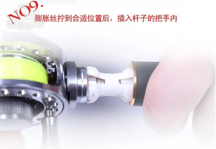 9. ¿Cómo fijarlo en el agujero inferior de la caña de pescar? Es fácil. Solo presta atención al cuál primero, cuál después. Y si el carrete está suelto después de probarlo, no debería haber entendido el método: hay una pequeña tuerca de plástico blanco que soporta la manga de expansión de nylon blanco, preste atención, la tuerca tiene 4 rieles, Debe encajar los rieles en los huecos de la manga de expansión antes de insertarlos en el orificio inferior de la caña de pescar.