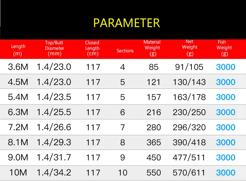 Longitud: 3,6-10m Longitud cerrada: 117cm