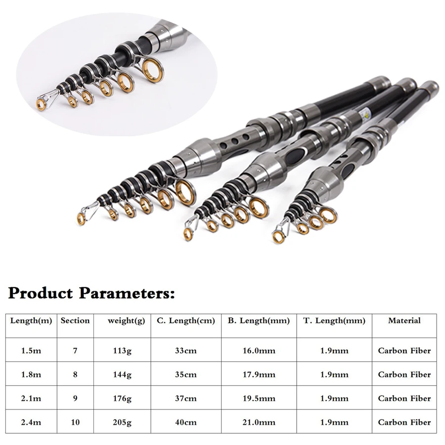 Mini caña de pescar telescópica portátil de fibra de carbono, 1,5-2,4 m, para mar, río, lago, barco, cañas de pescar de alta resistencia