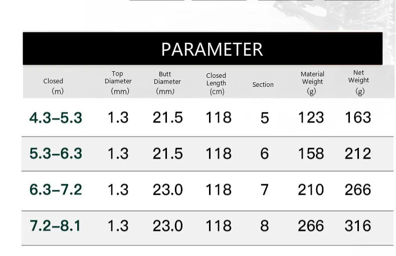 4. La longitud total de la varilla se puede cerrar, por ejemplo, 5,3 m se puede cerrar a 4,3 m, 6,3 m-5,3 m, 7,2 m-6,3 m, 8,1 m-7,2 m.