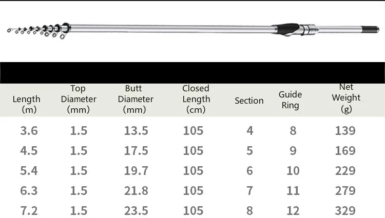 Longitud: 3,6-7,2 m Longitud cerrada: 105cm